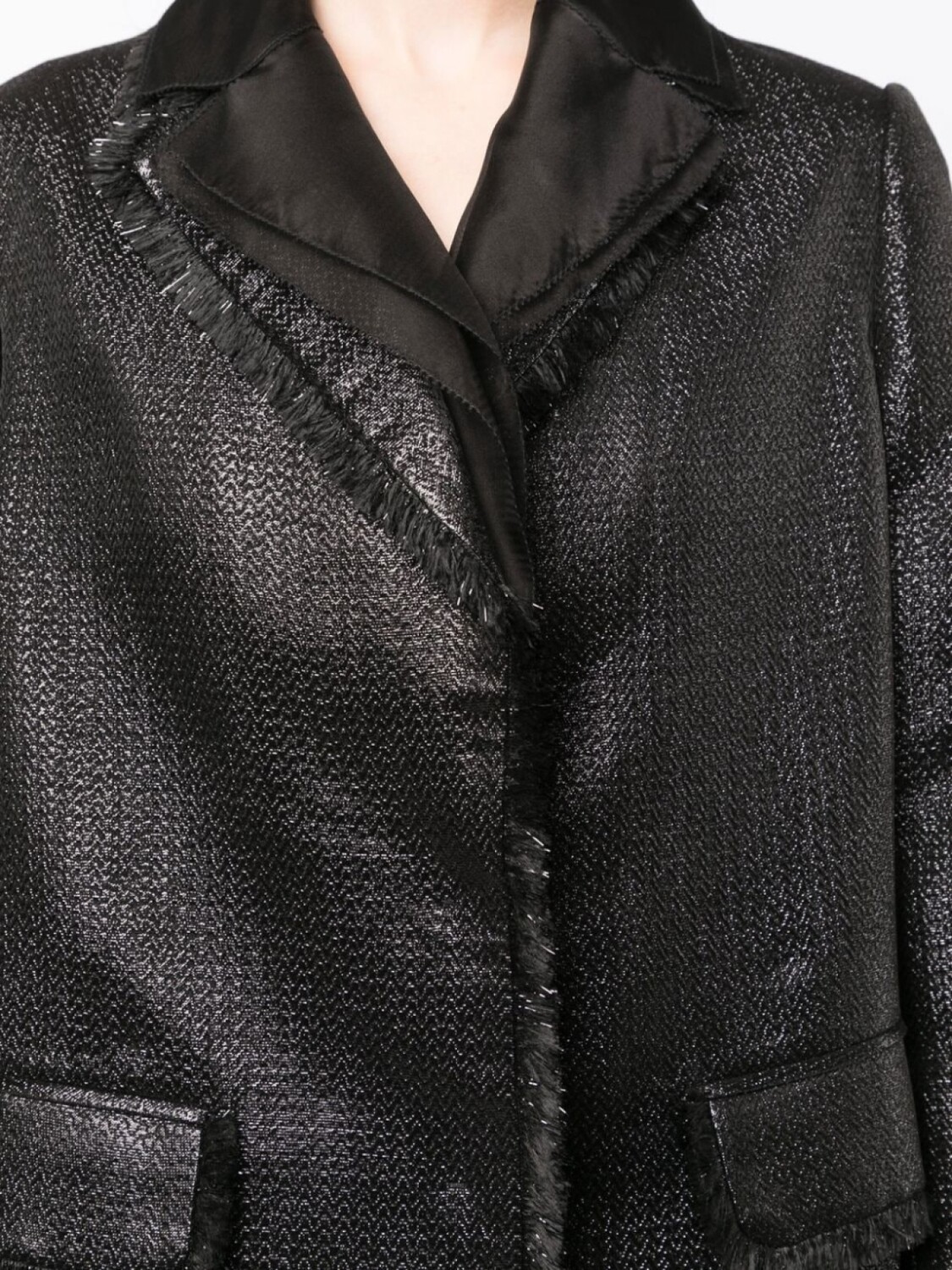 Черный, смесовая шерсть, покрытие с эффектом металлик, края с бахромой, широкие зазубренные лацканы и длинные рукава.