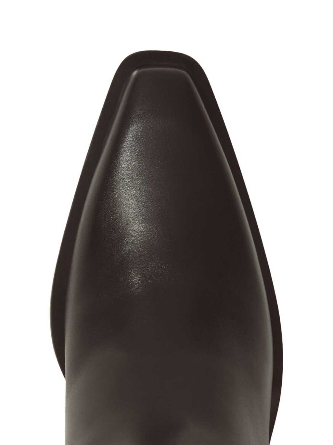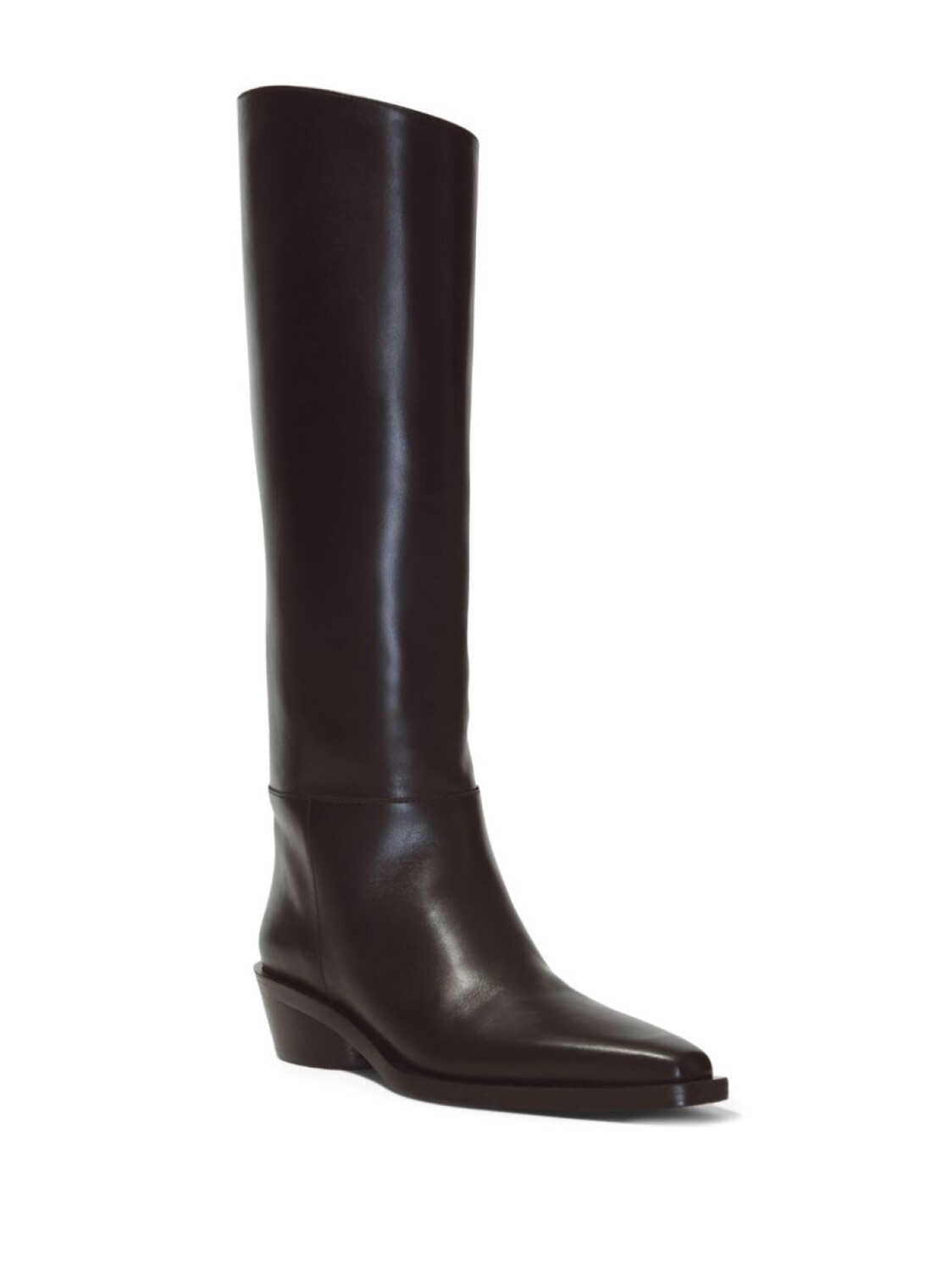 Черный, кожа, гладкая текстура кожи, заостренный носок, низкий блочный каблук, длина по колено и модель без застежки.