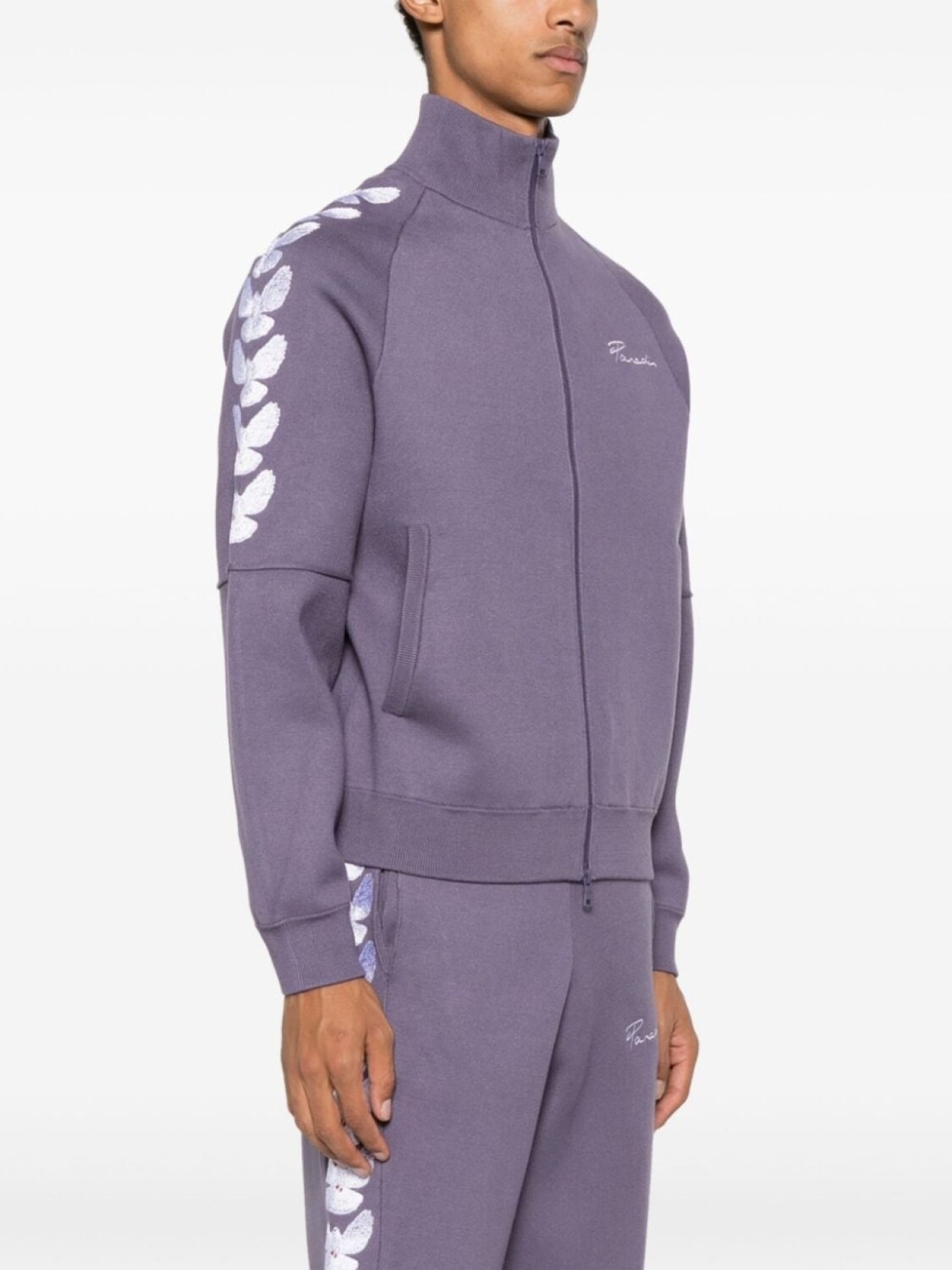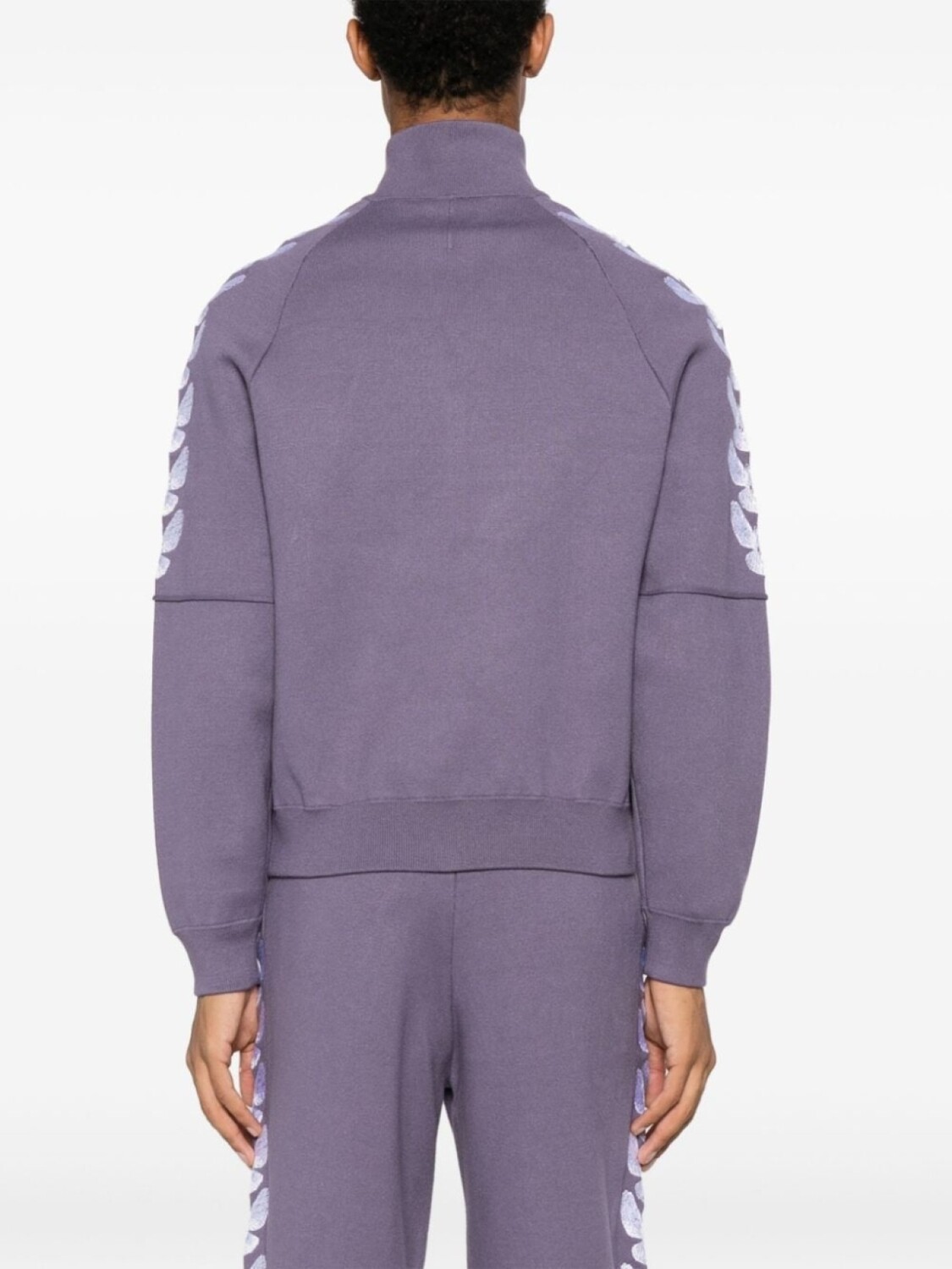 Фиолетовый, белый, вставки, принт с логотипом на груди, рукава с графичным принтом, воротник-труба, двусторонняя молния спереди, длинные рукава и два передних кармана с листочкой.