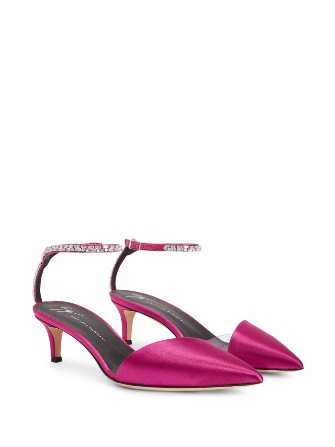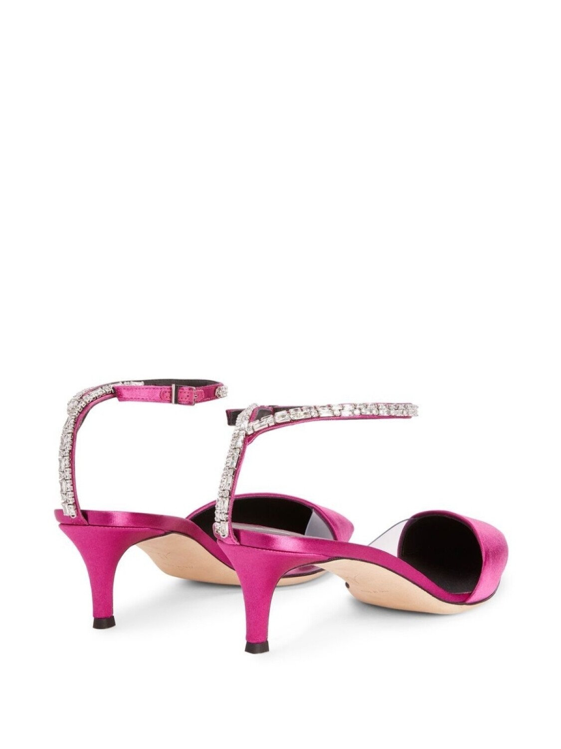 Фуксия, кожа, декор из кристаллов, заостренный носок, ремешок на щиколотке с пряжкой, стелька с логотипом и каблук-рюмка.