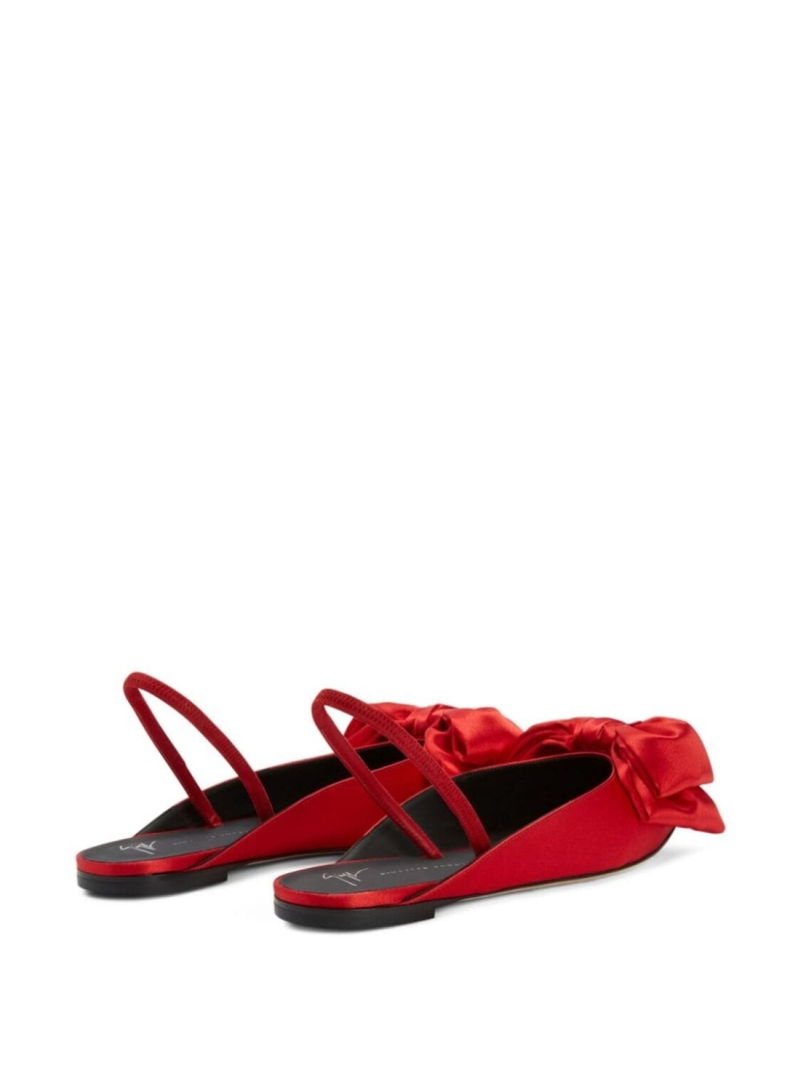 Ярко-красный, сатиновая фактура, крупный бант, заостренный носок, ремешок на пятке, стелька с логотипом и плоская кожаная подошва.