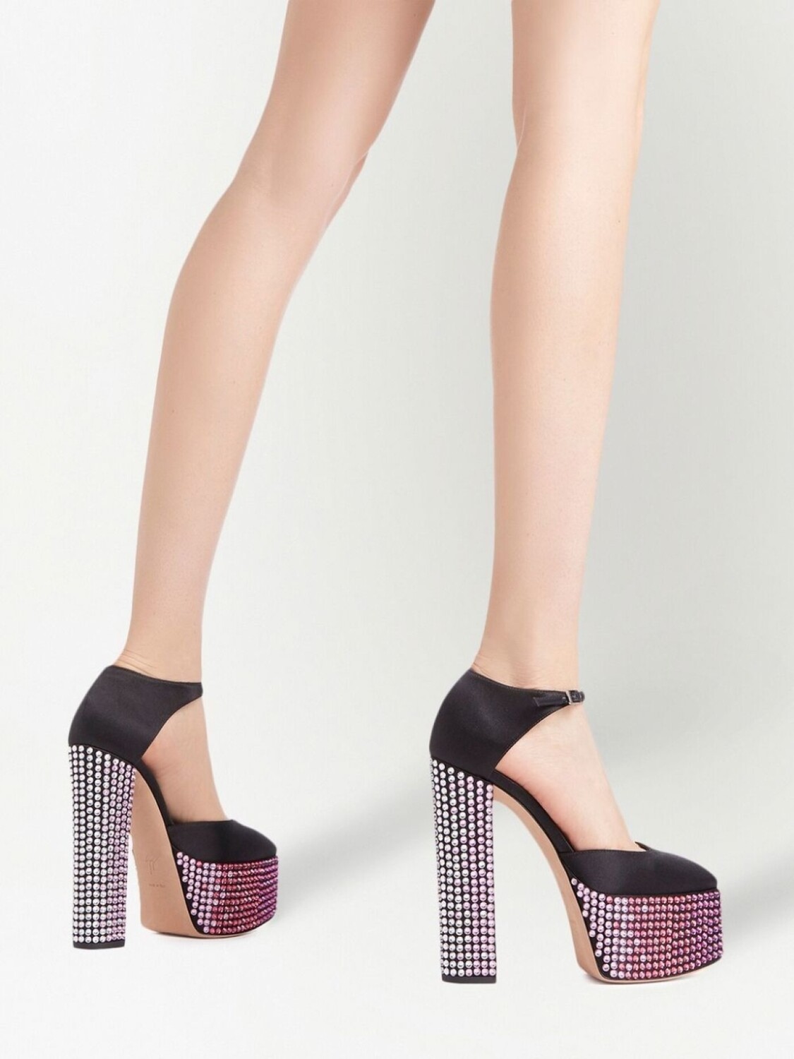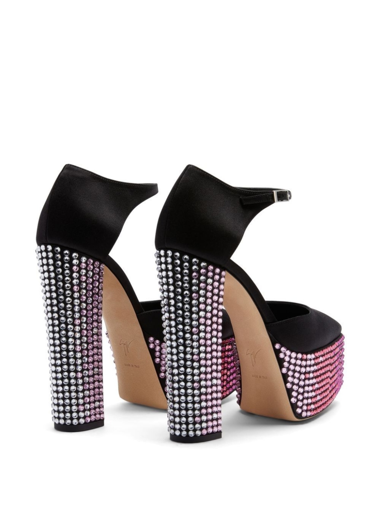 Черный/разноцветный, замша, украшения из горного хрусталя, кожаная стелька с логотипом, квадратный носок, ремешок на щиколотке с пряжкой, высокий блочный каблук, подошва на платформе и кожаная подошва.