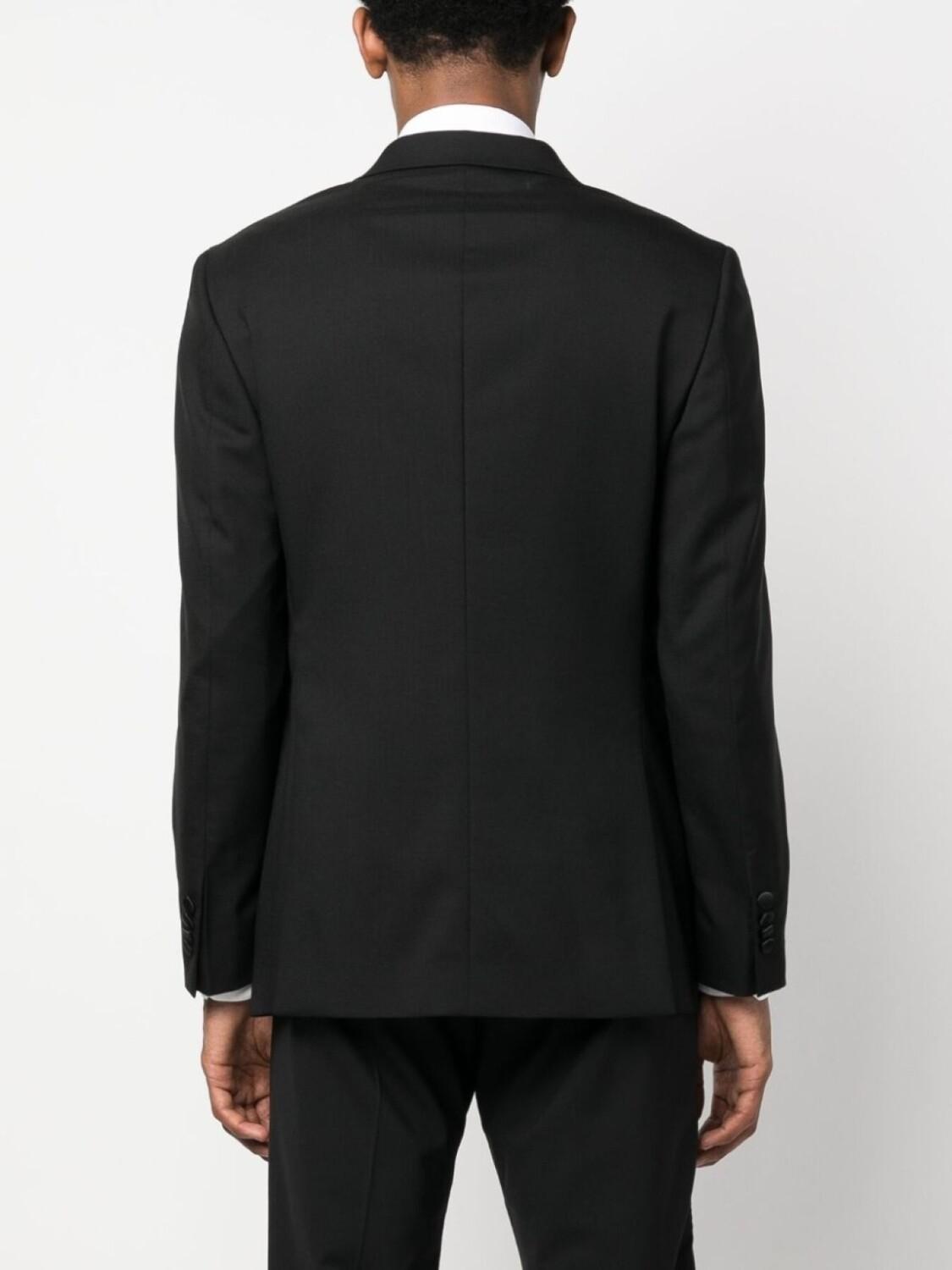 Черный, необработанная шерсть, сатиновая фактура, зазубренные лацканы, застежка на пуговицах спереди, длинные рукава, манжеты на пуговицах, прорезной карман на груди, два прорезных кармана сбоку и две боковые шлицы сзади.