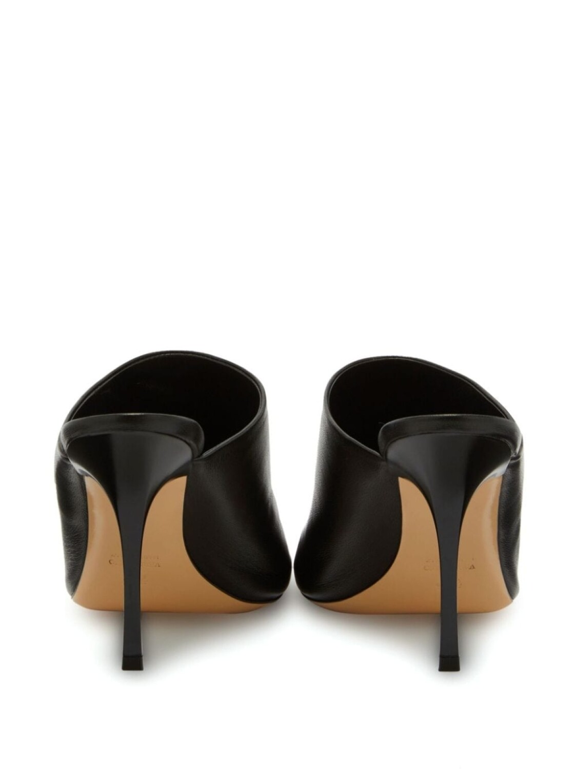 Черный, кожа, зернистая текстура, маленькая подвеска с логотипом, открытый носок, квадратный носок, кожаная стелька с логотипом, каблук на высокой шпильке и модель без застежки.