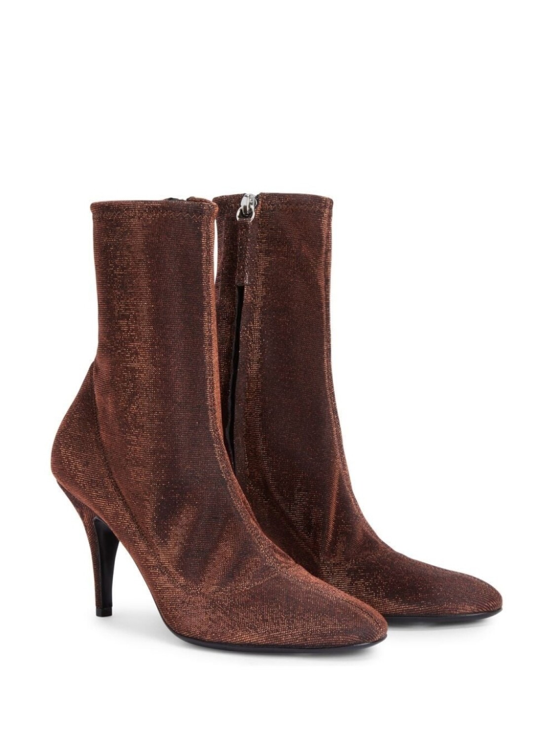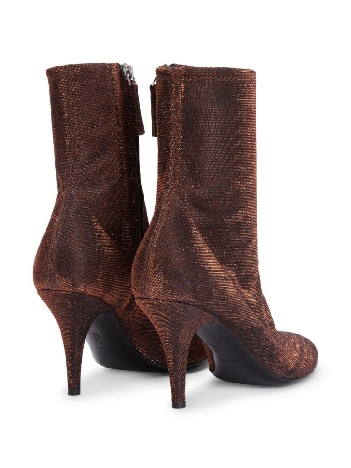 Коричневый, металллизированное покрытие, кожаная стелька с логотипом, миндалевидный носок, застежки на молнии сбоку, высота по щиколотку и каблук на высокой шпильке.