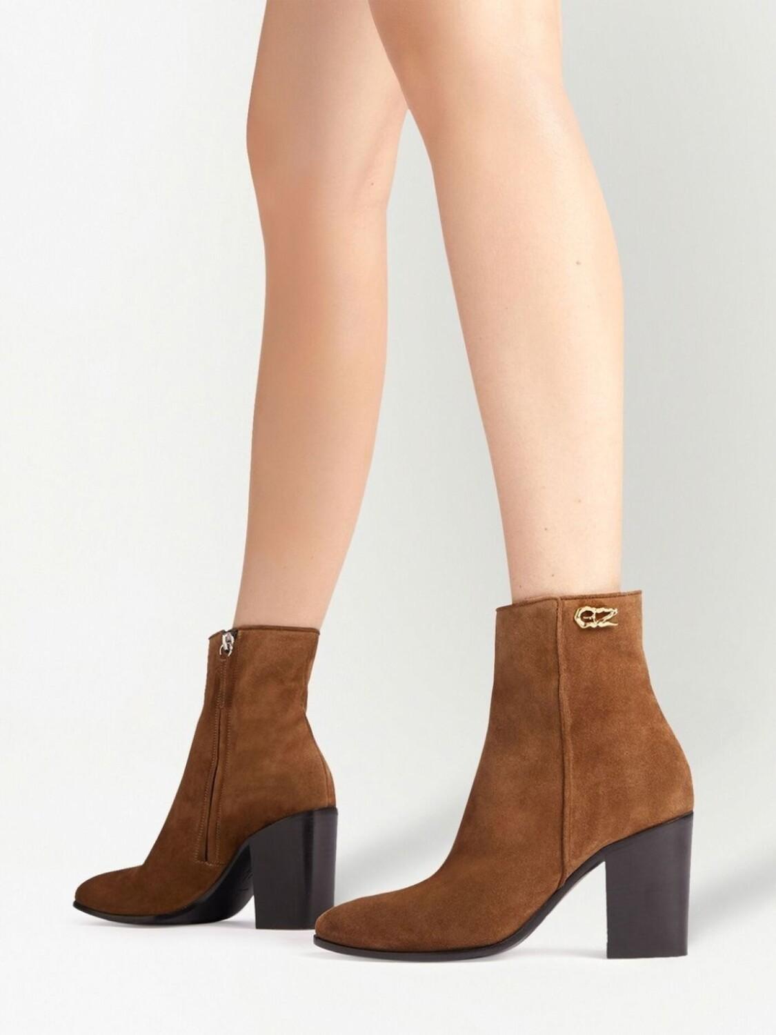 Коричневый, кожа, замша, золотистый металлический логотип, миндалевидный носок, высота по щиколотку, застежка на молнии сбоку и высота по щиколотку.