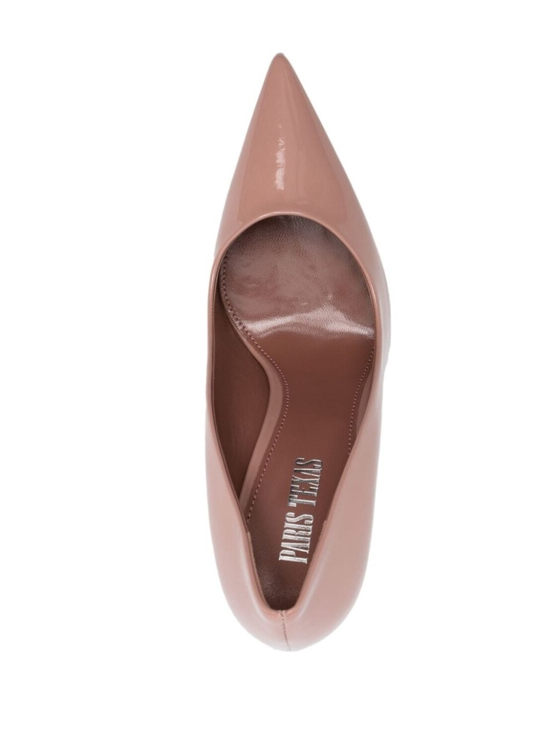 Пудрово-розовый, телячья кожа, лакированная отделка, заостренный носок, стелька с логотипом и каблук на высокой шпильке.