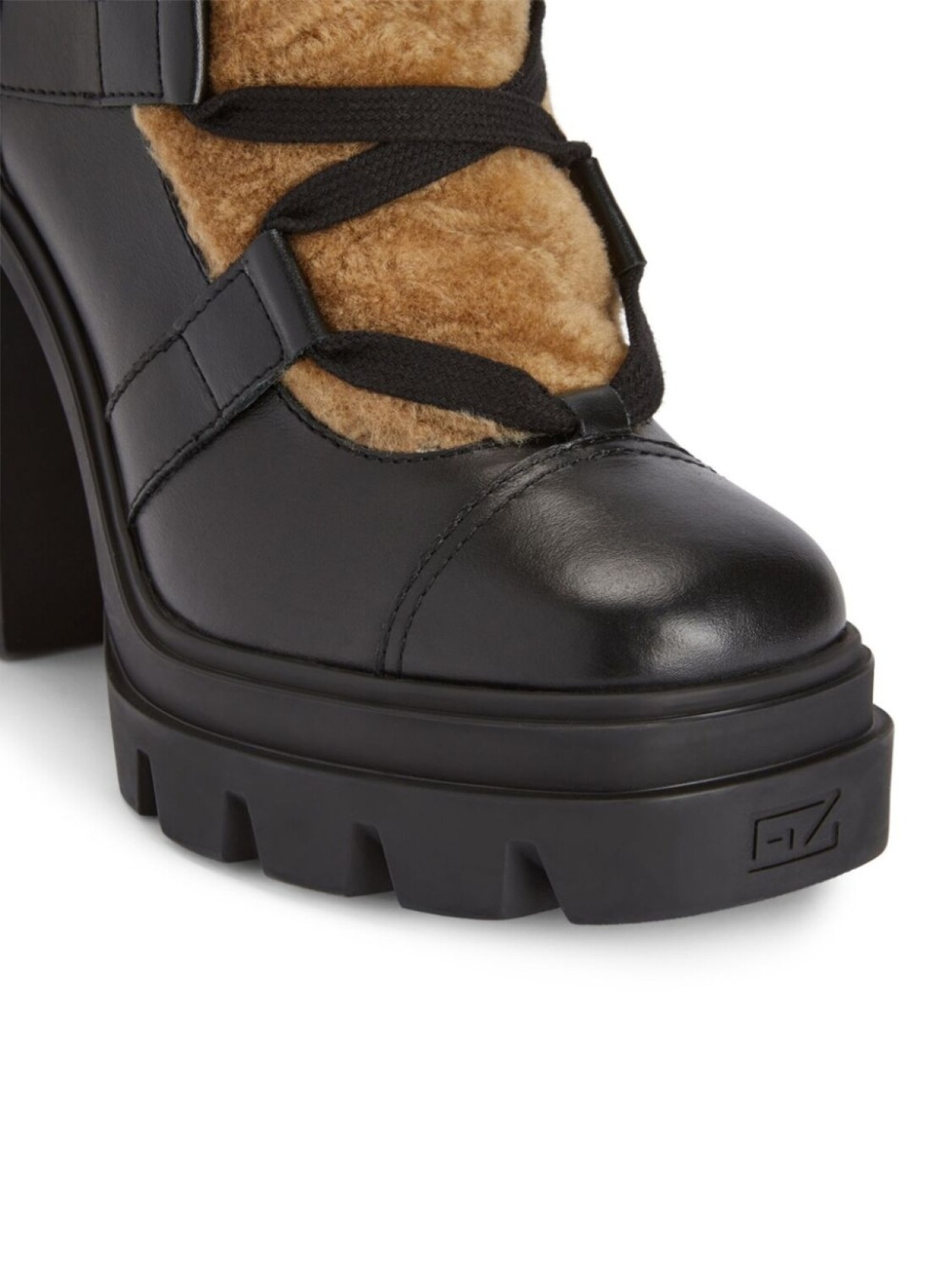 Черный, кожа, золотистый логотип, петля для подтягивания сзади, золотистая фурнитура, закругленный носок, шнуровка спереди и высокий блочный каблук.