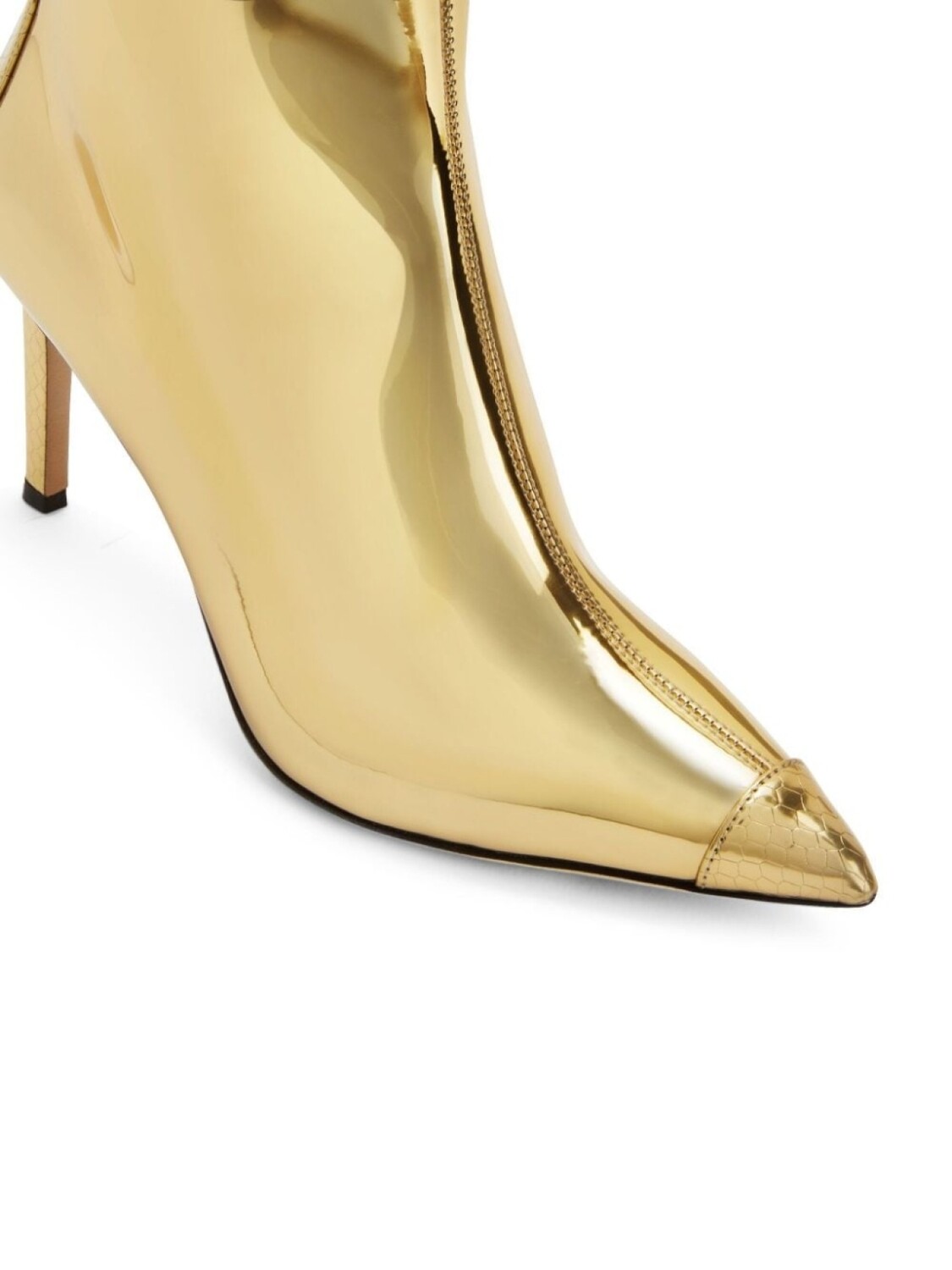 Золотистый, кожа, эффект металлик, застежка на молнии сбоку, заостренный носок, стелька с логотипом и высокий каблук.