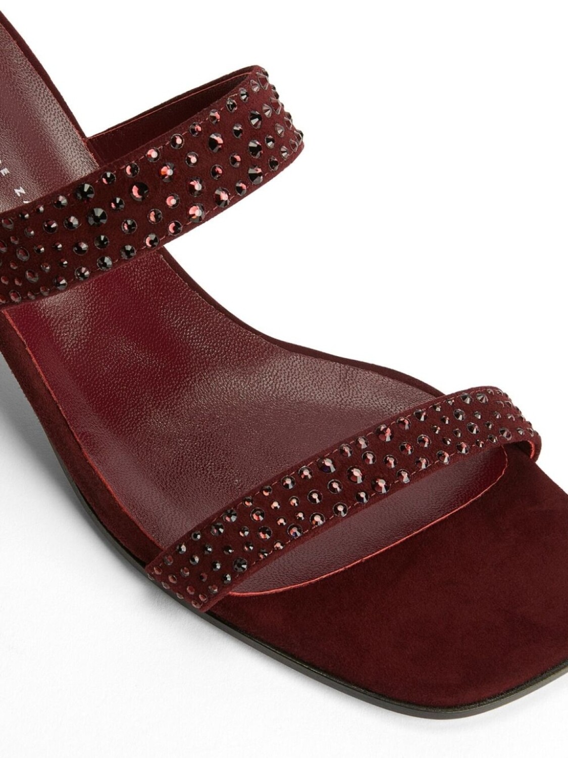 Бордовый, замша, кожа, украшения из горного хрусталя, кожаная стелька с логотипом, открытый носок, модель без застежки, ремешок на палец и каблук средней высоты.