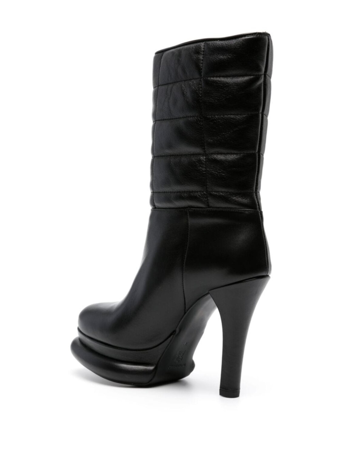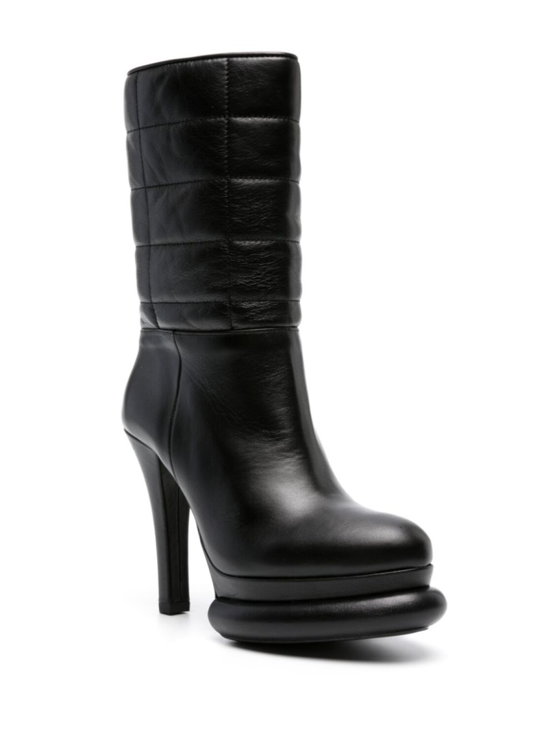 Черный, телячья кожа, смягчающее покрытие, стеганые вставки, миндалевидный носок, модель без застежки, высота по щиколотку, высокий каблук, кожаная стелька с логотипом, подошва на платформе и кожаная подошва.