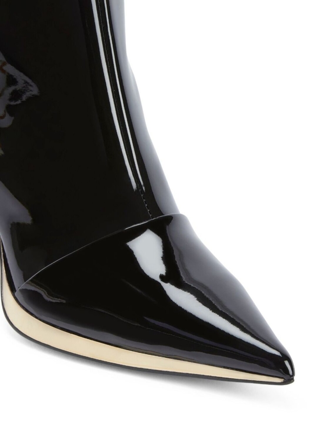 Черный, лакированная отделка, заостренный носок, золотистая фурнитура, каблук на высокой шпильке и высота по щиколотку.
