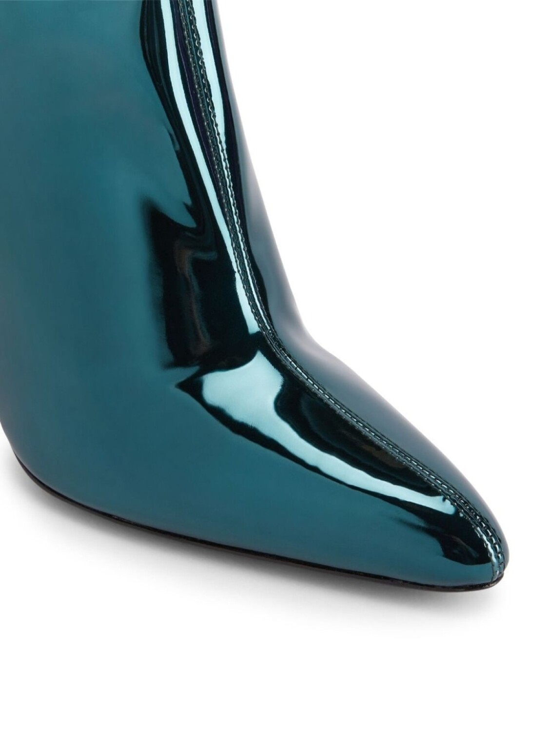 Сине-зеленый, кожа, лакированная отделка, застежки на молнии сбоку, высота по щиколотку, заостренный носок и высокий каблук.