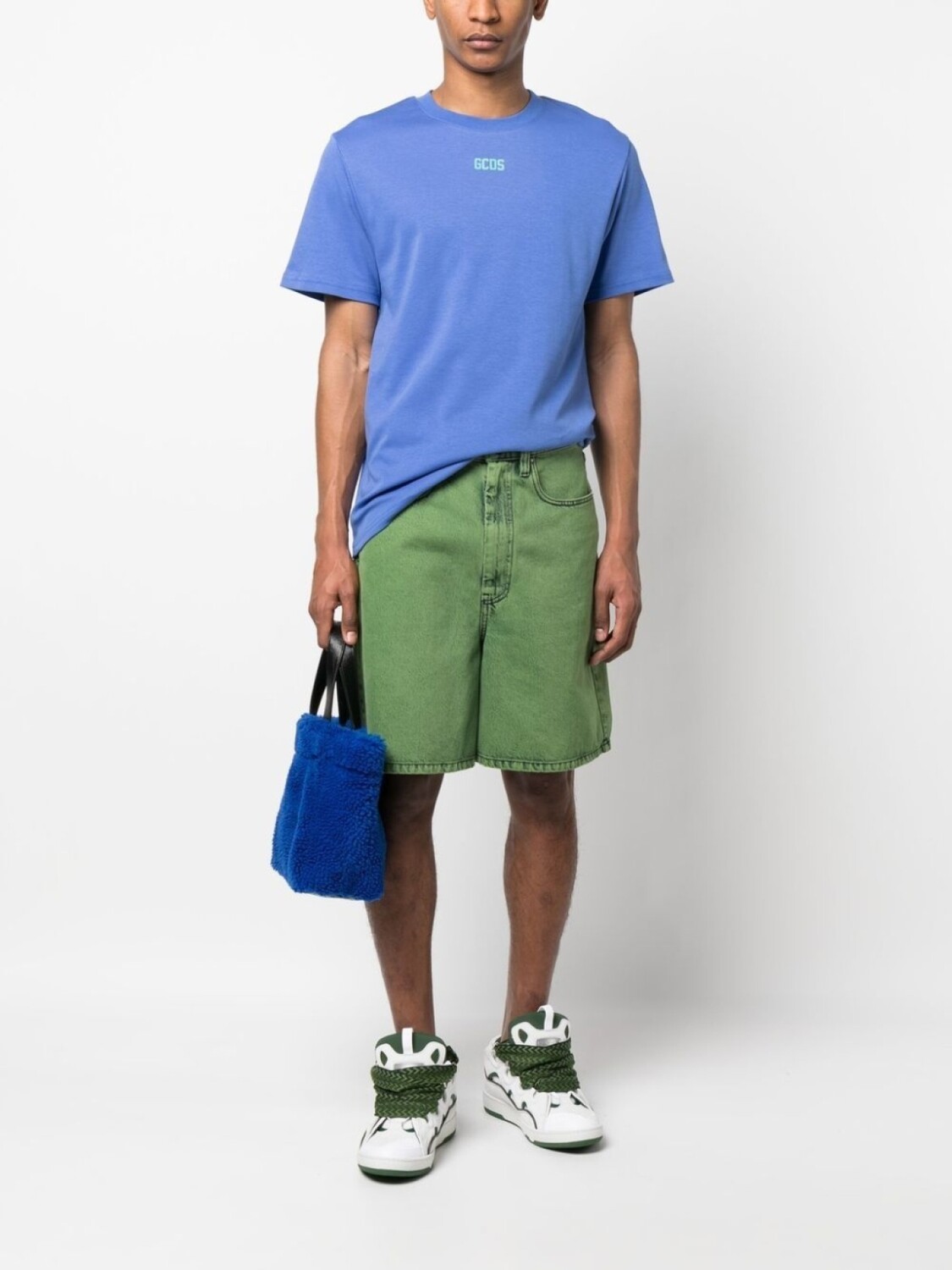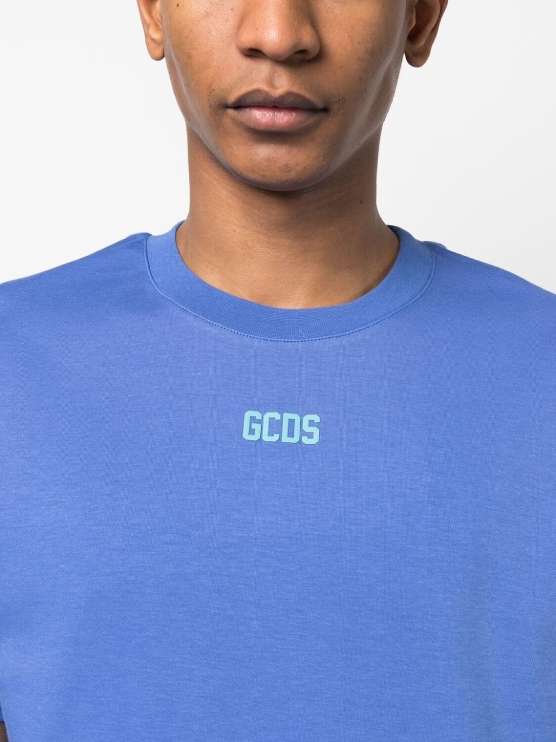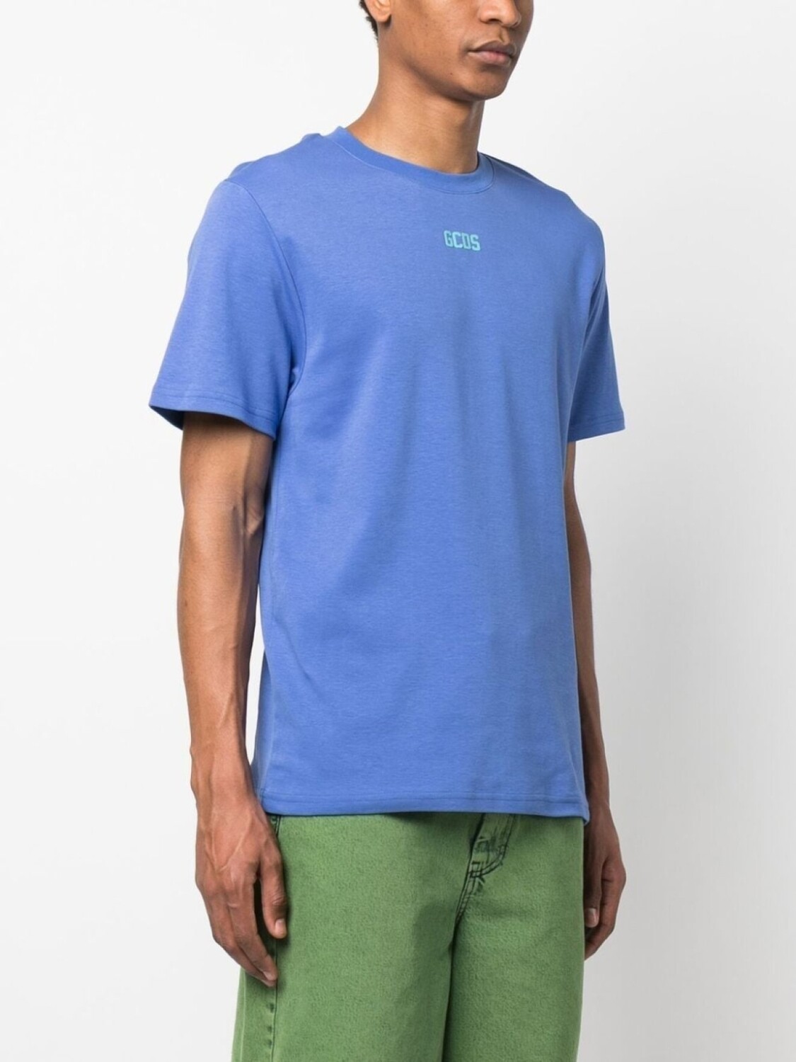 Кобальтово-синий, хлопок, круглый вырез, принт с логотипом на груди, короткие рукава и прямой подол.