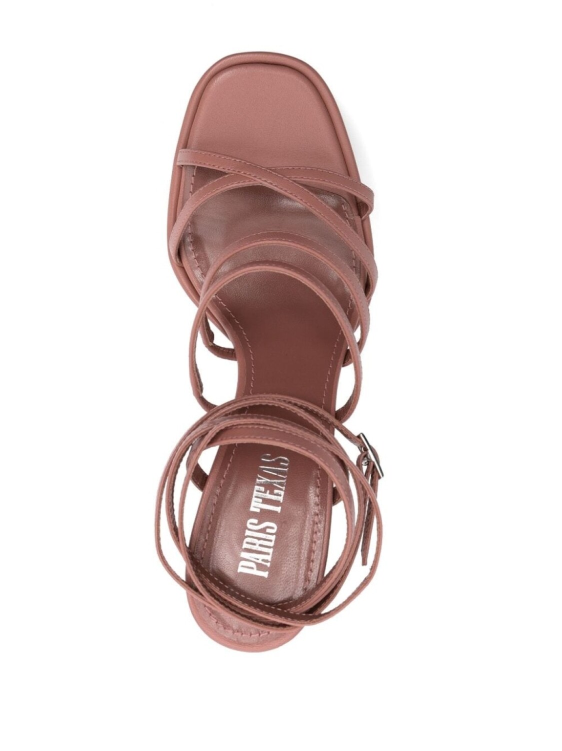 Темно-розовый, телячья кожа, открытый носок, перекрестные ремешки, ремешок на щиколотке с пряжкой, блочный каблук, кожаная стелька с логотипом и подошва на платформе.