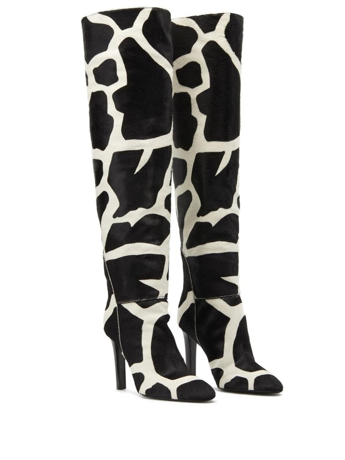 Сапоги с анималистичным принтом от Giuseppe Zanotti (Джузеппе Занотти). Длина по колено, закругленный носок, высокий каблук, длина по колено и жирафовый принт.