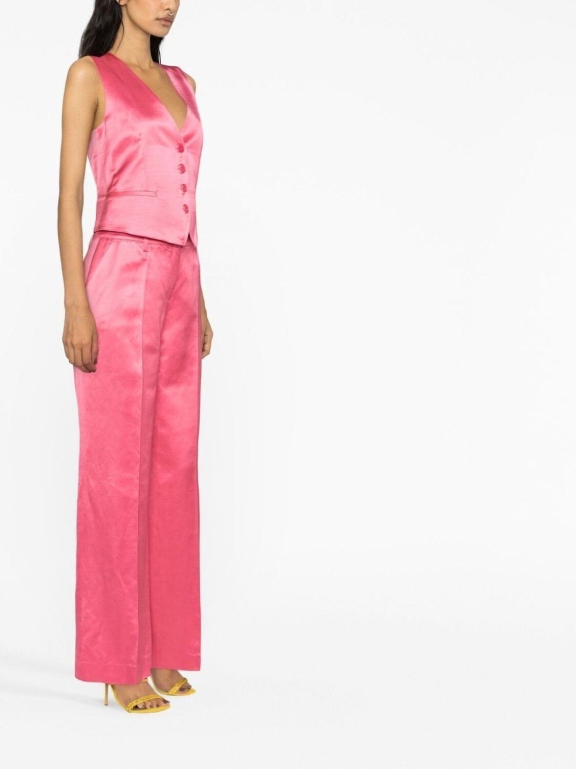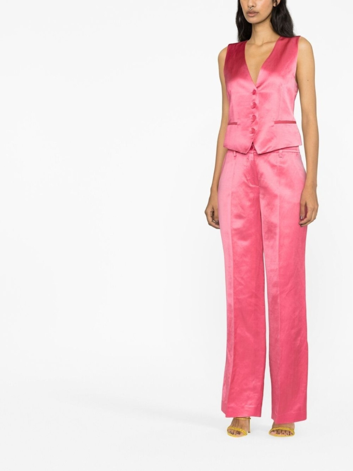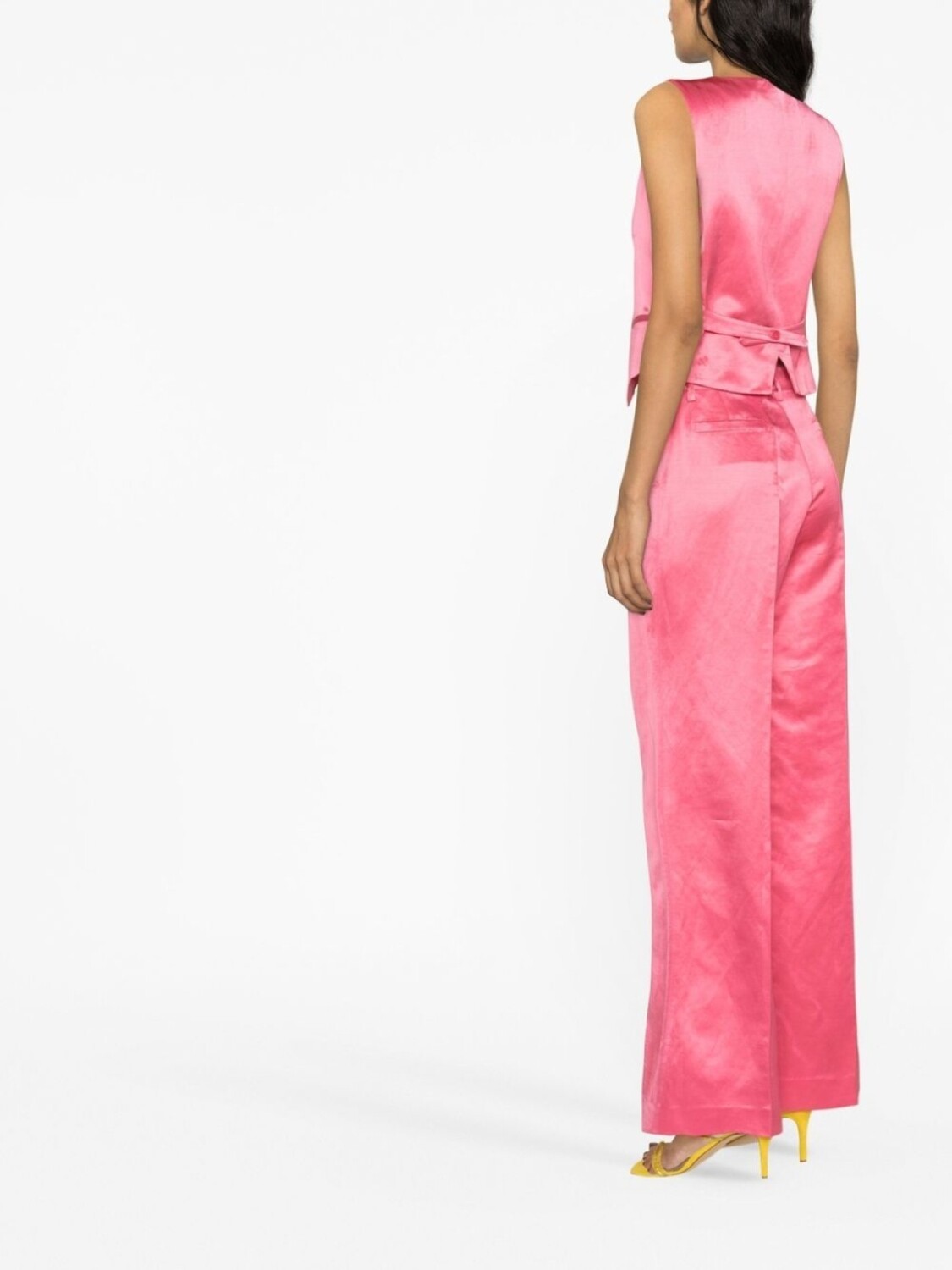 Розовый, сатиновая фактура, V-образный вырез, застежка на пуговицах спереди, без рукавов, два прорезных кармана спереди, регулируемый ремешок сзади и шлица по центру сзади.