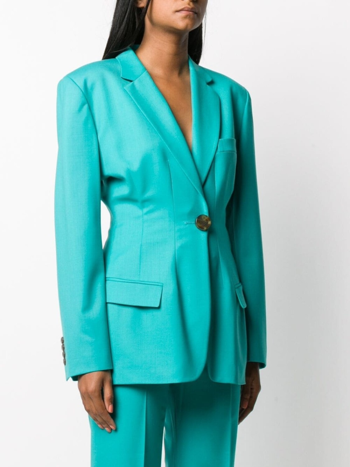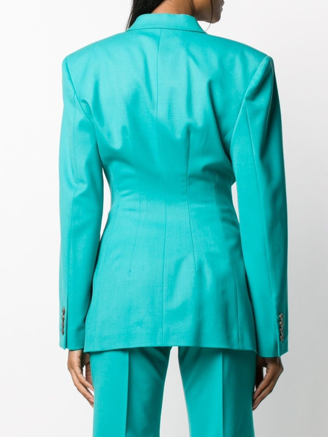 Зазубренные лацканы, прорезной карман на груди, застежка на пуговицах спереди, золотистые пуговицы с тиснением и длинные рукава.