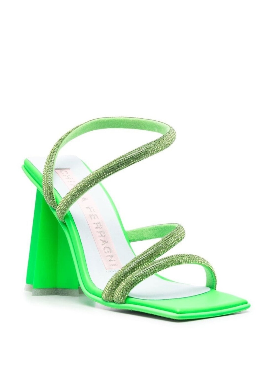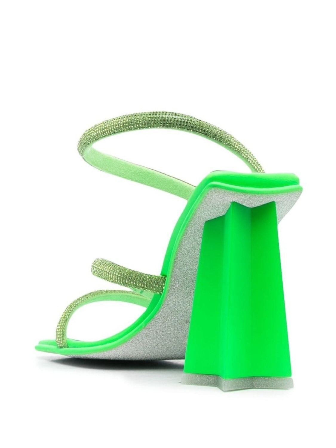 Неоново-зеленый, телячья кожа, покрытие с эффектом металлик, декор из кристаллов, открытый носок, стелька с логотипом и высокий блочный каблук.
