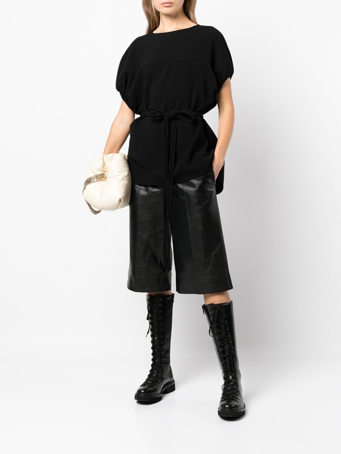 Ремень на талии, круглый вырез и короткие рукава. Цвет: черный.