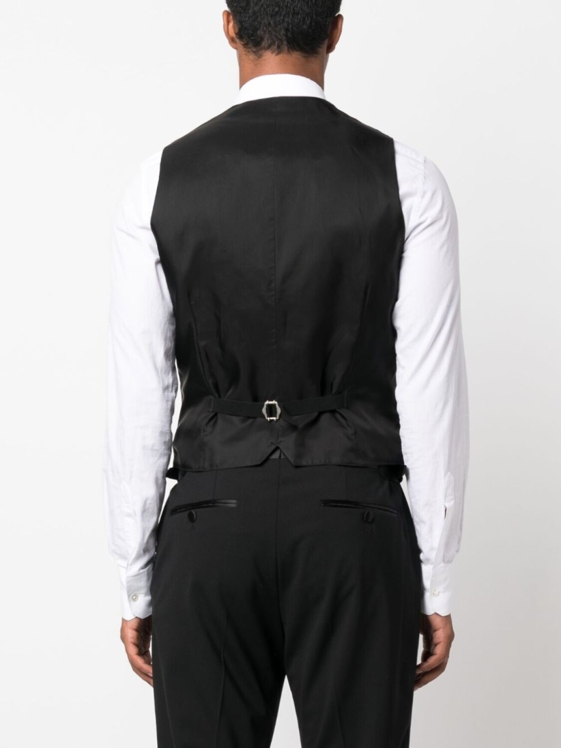 Черный, хлопок, V-образный вырез, застежка на пуговицах спереди, регулируемый ремешок сзади, без рукавов, ластовицы на подоле и два прорезных кармана сбоку.