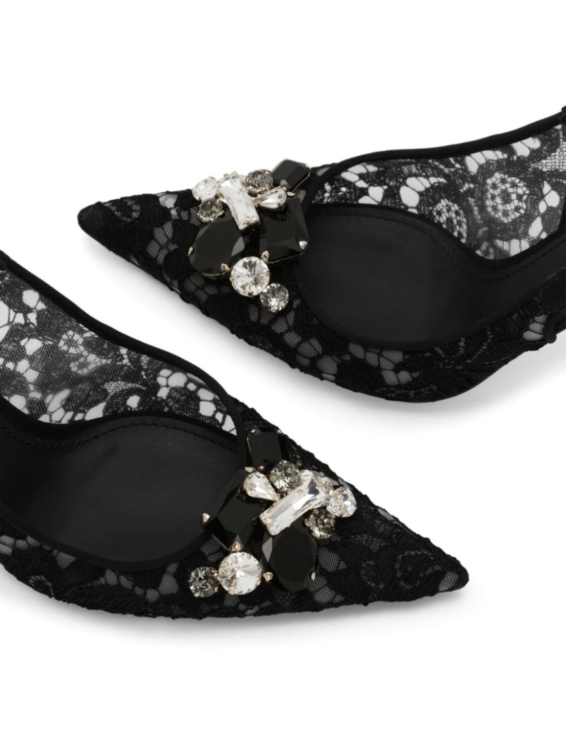 Черный, прозрачные кружевные вставки, декор из кристаллов, золотистый металлический логотип, ремешок на пятке с пряжкой, заостренный носок, кожаная стелька с логотипом, кожаная подошва и каблук на высокой шпильке.