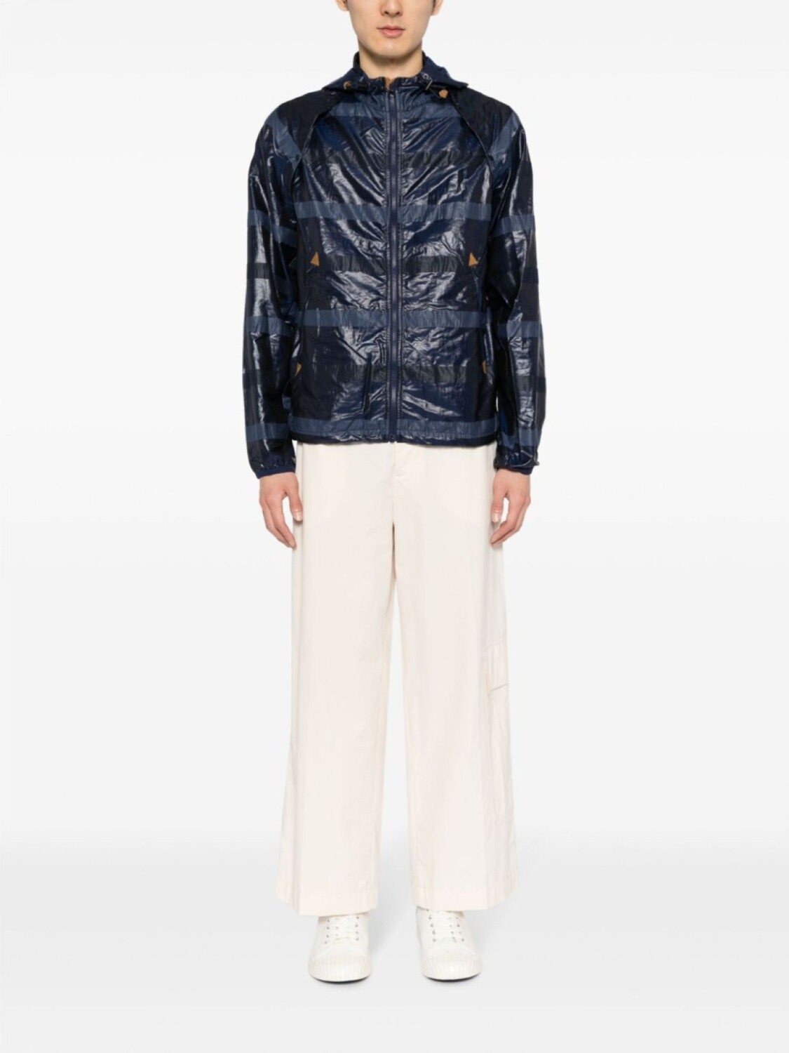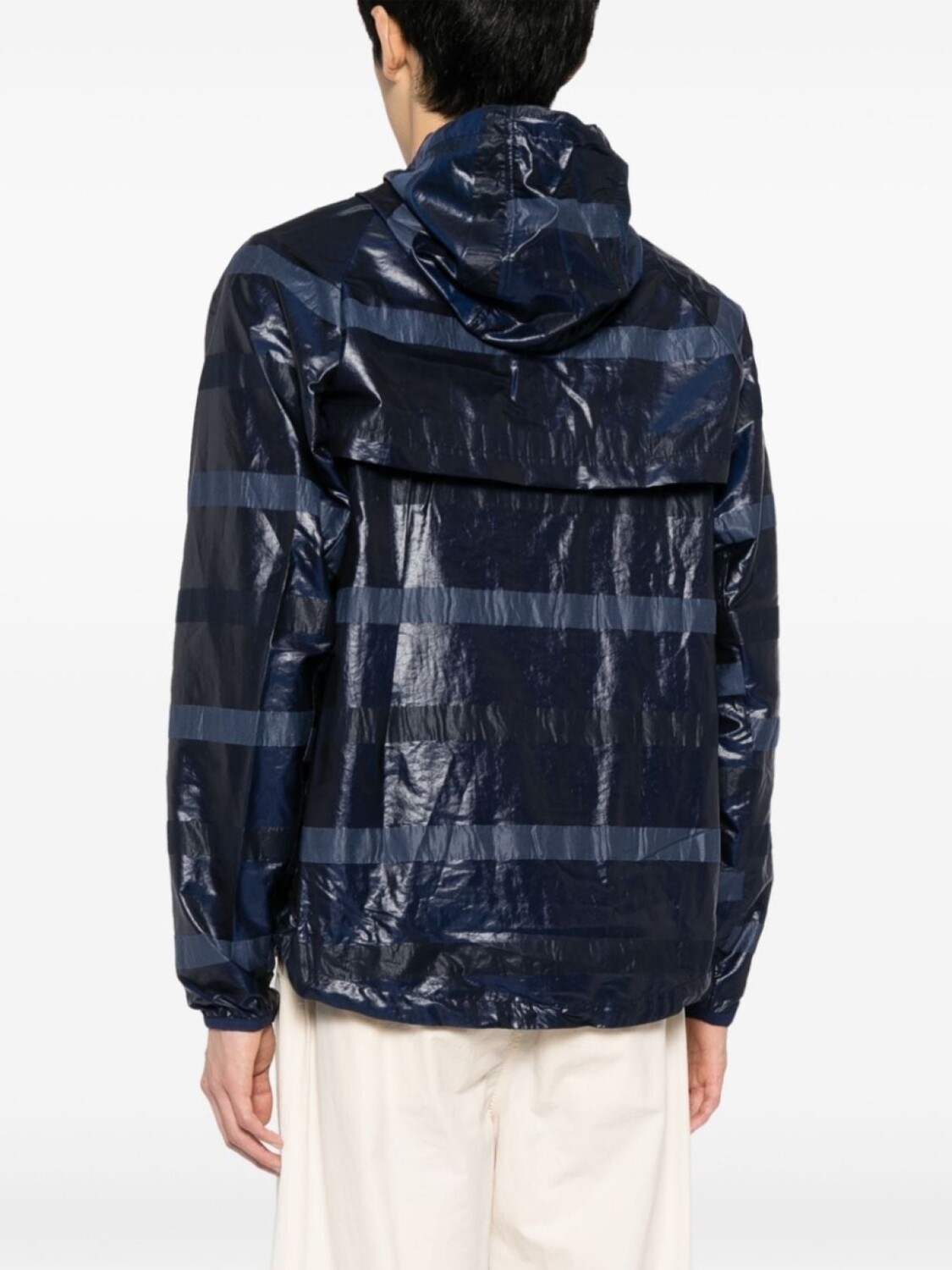 Темно-синий, глянцевая фактура, вставки, съемные вставки, узор в горизонтальную полоску, объемный капюшон на шнурке, застежка на молнии спереди, длинные рукава, два кармана по бокам и прямой подол.