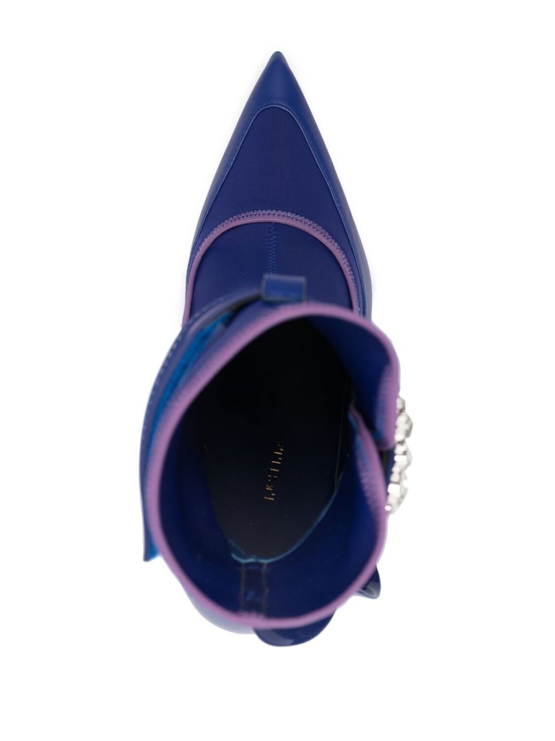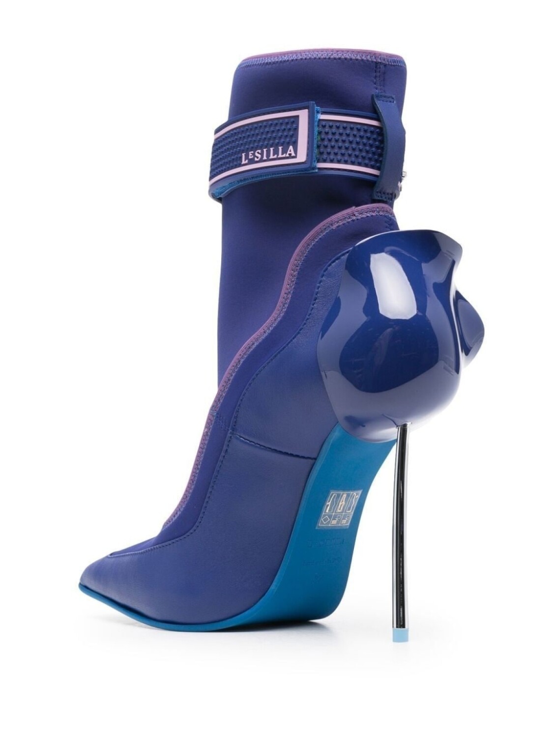 Лилово-синий, телячья кожа, контрастные вставки, ремешок на щиколотке с отделкой кристаллами, заостренный носок, застежка на липучке, высота по щиколотку, каблук на высокой шпильке, кожаная подкладка и резиновая подошва.