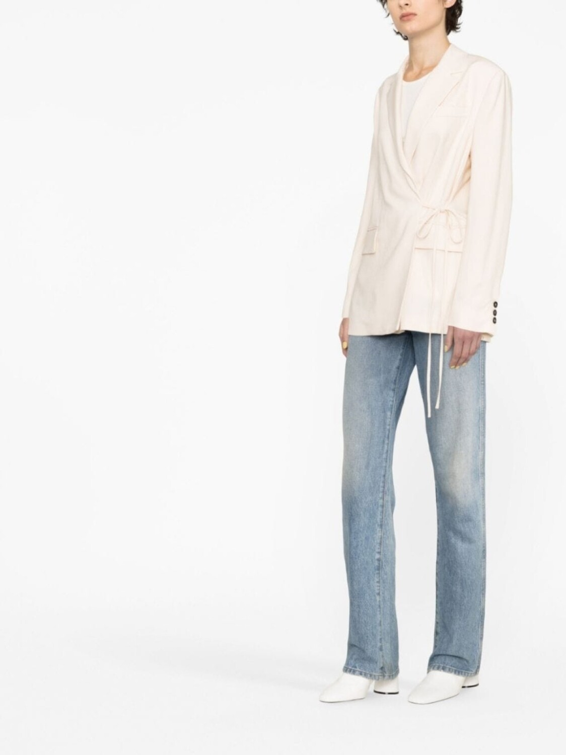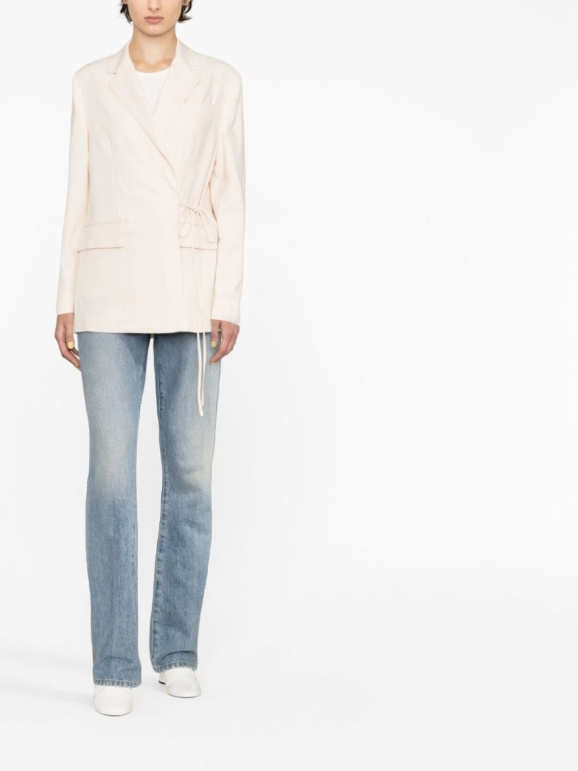 Бежевый, зазубренные лацканы, длинные рукава, завязки по бокам и два передних кармана с клапанами.