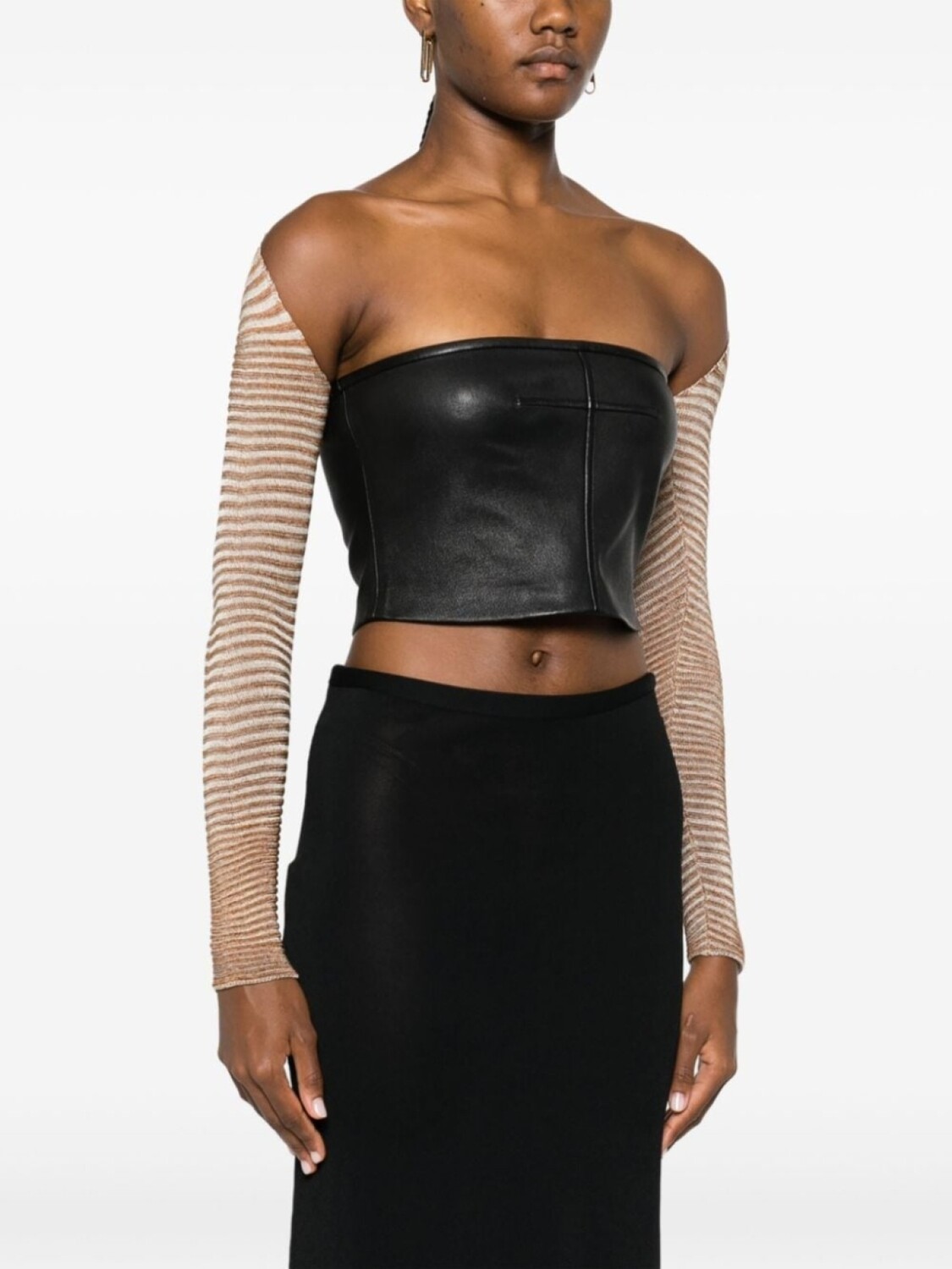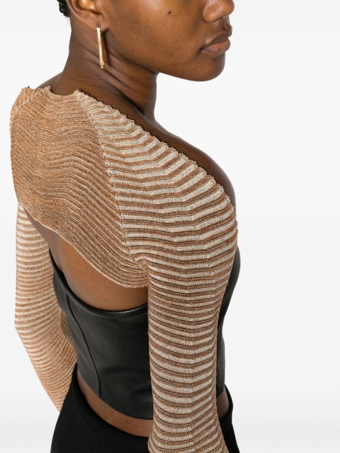 Бежевый, трикотаж в рубчик, модель без застежки, длинные рукава и укороченная длина.