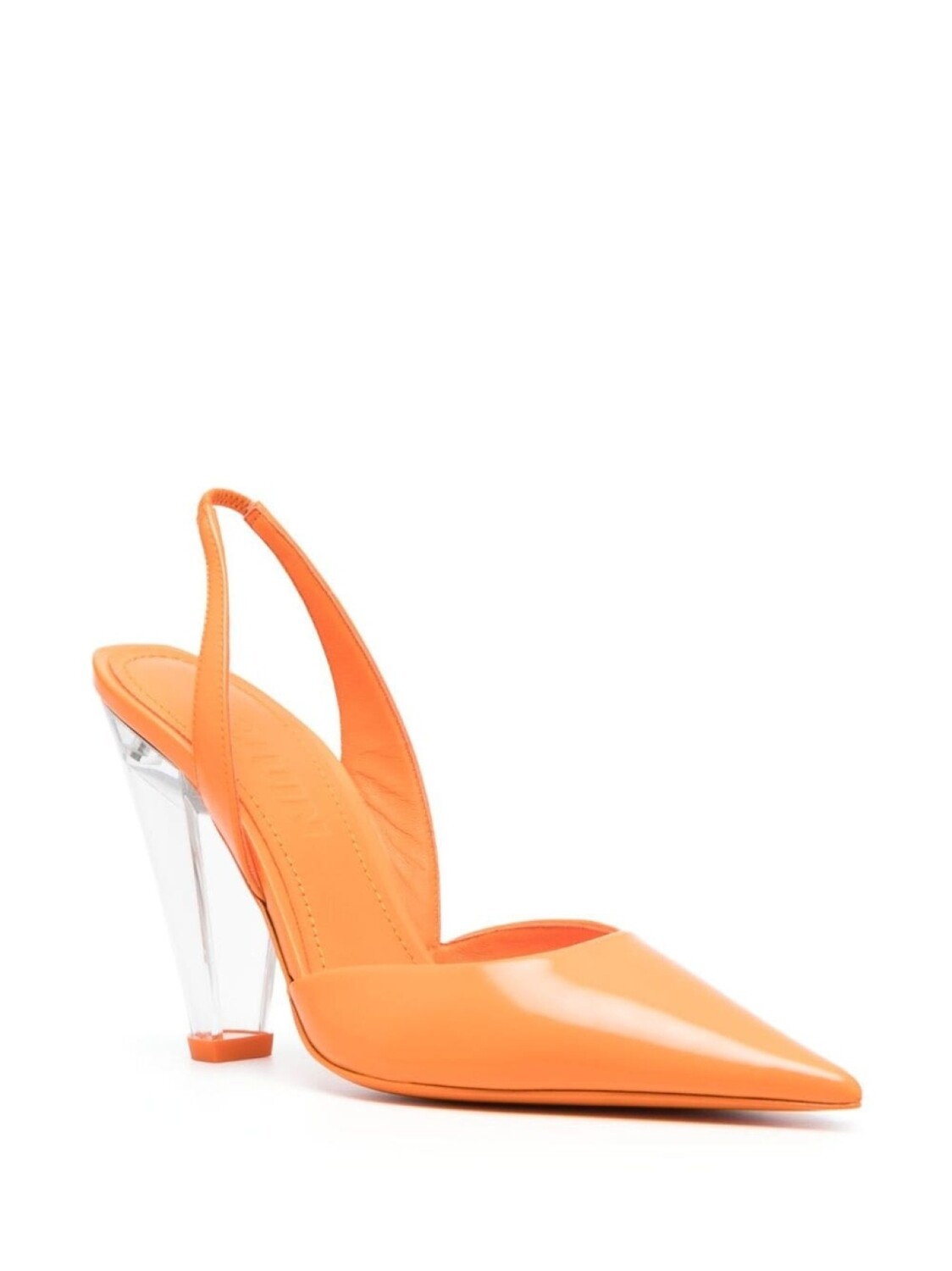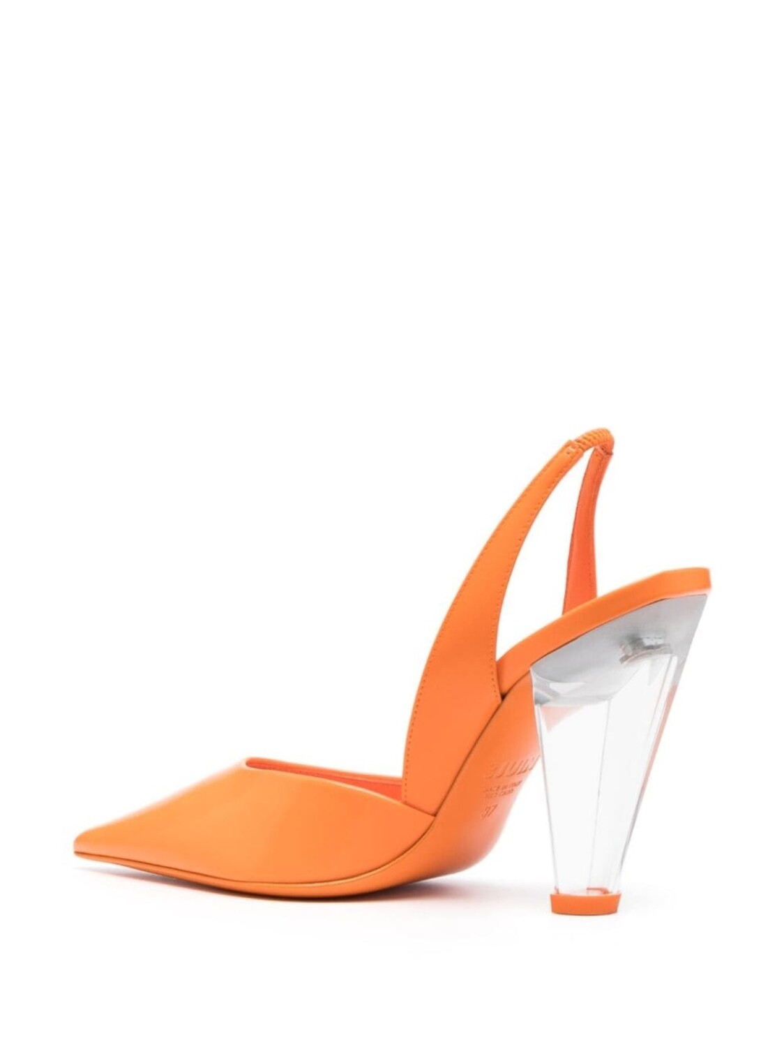 Темно-оранжевый, заостренный носок, ремешок на пятке и высокий скульптурный каблук.