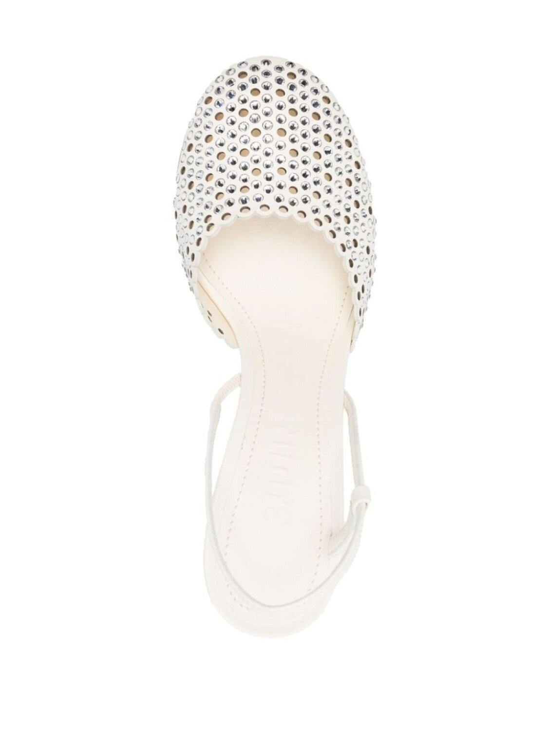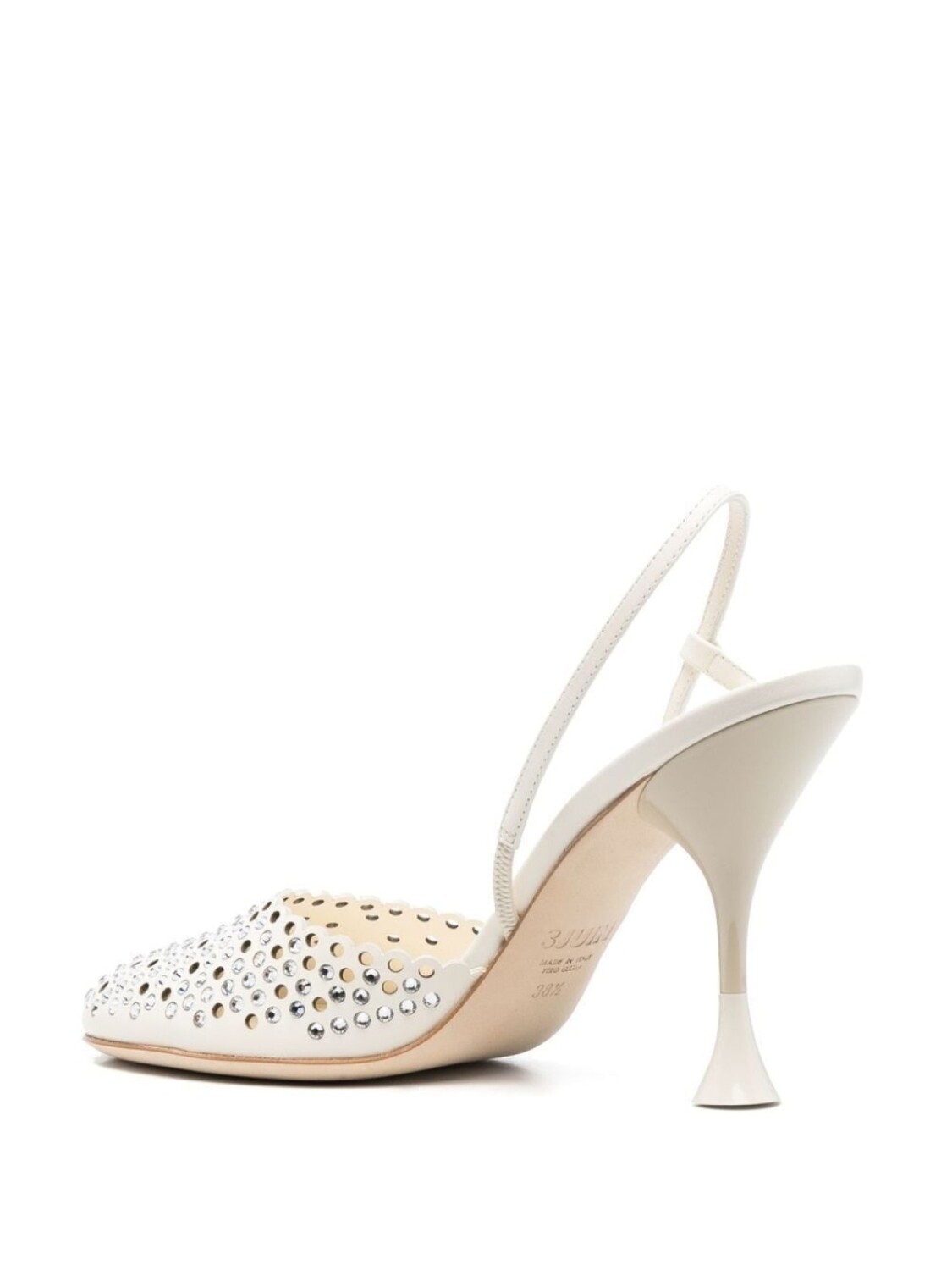 Цвет слоновой кости, телячья кожа, кожаная стелька с логотипом, украшения из горного хрусталя, закругленный носок, ремешок на пятке и высокий скульптурный каблук.