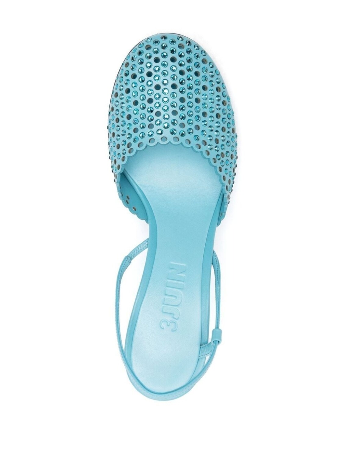 Бирюзовый, телячья кожа, декор из стеклянных кристаллов, миндалевидный носок, стелька с логотипом и конический каблук средней высоты.