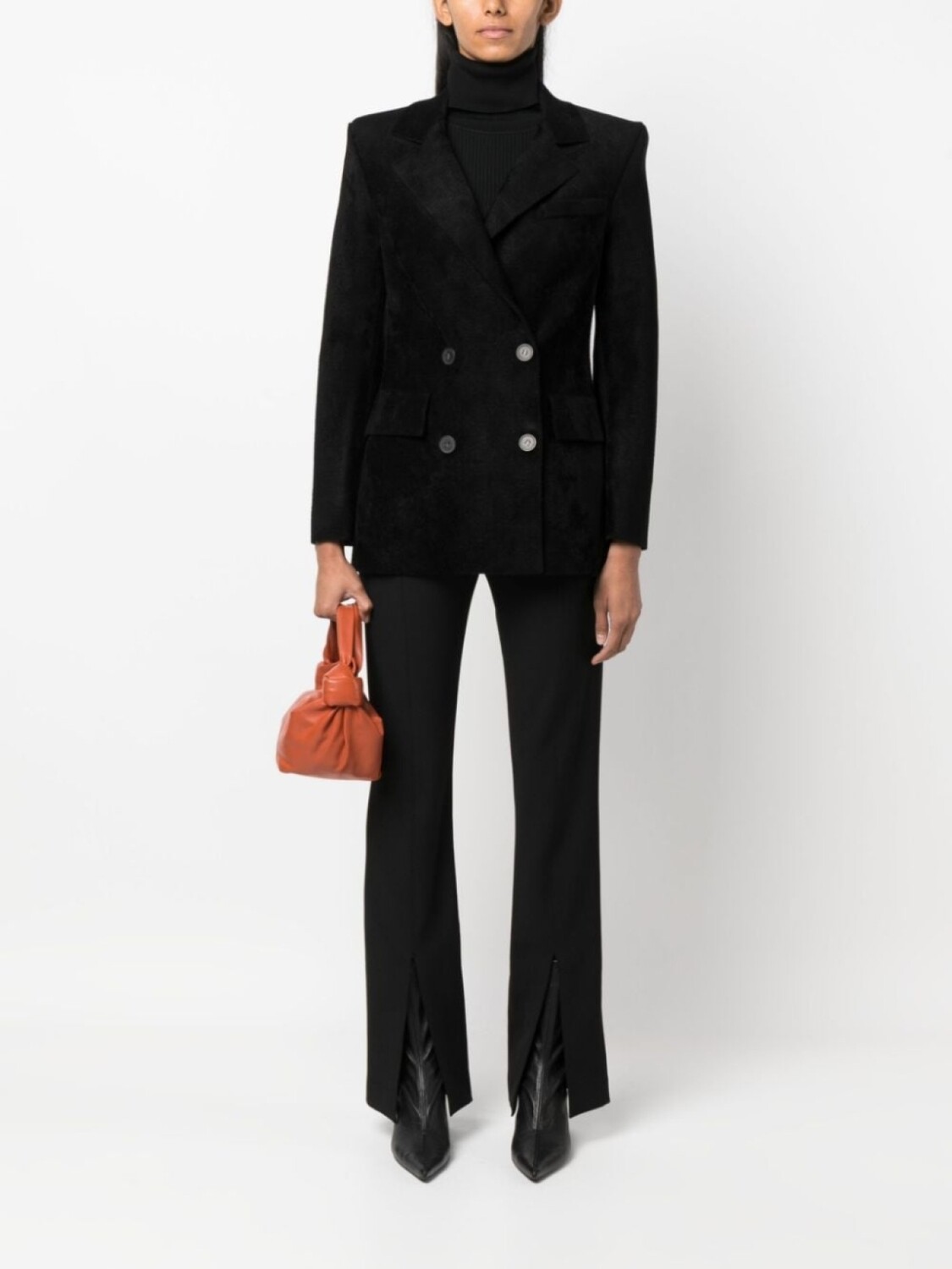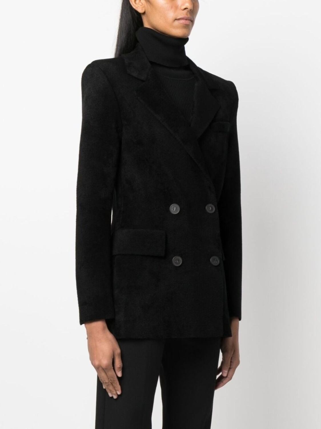 Черный, зазубренные лацканы, двубортная застежка на кнопки, два передних кармана с клапанами, длинные рукава, манжеты на пуговицах и прямой подол.