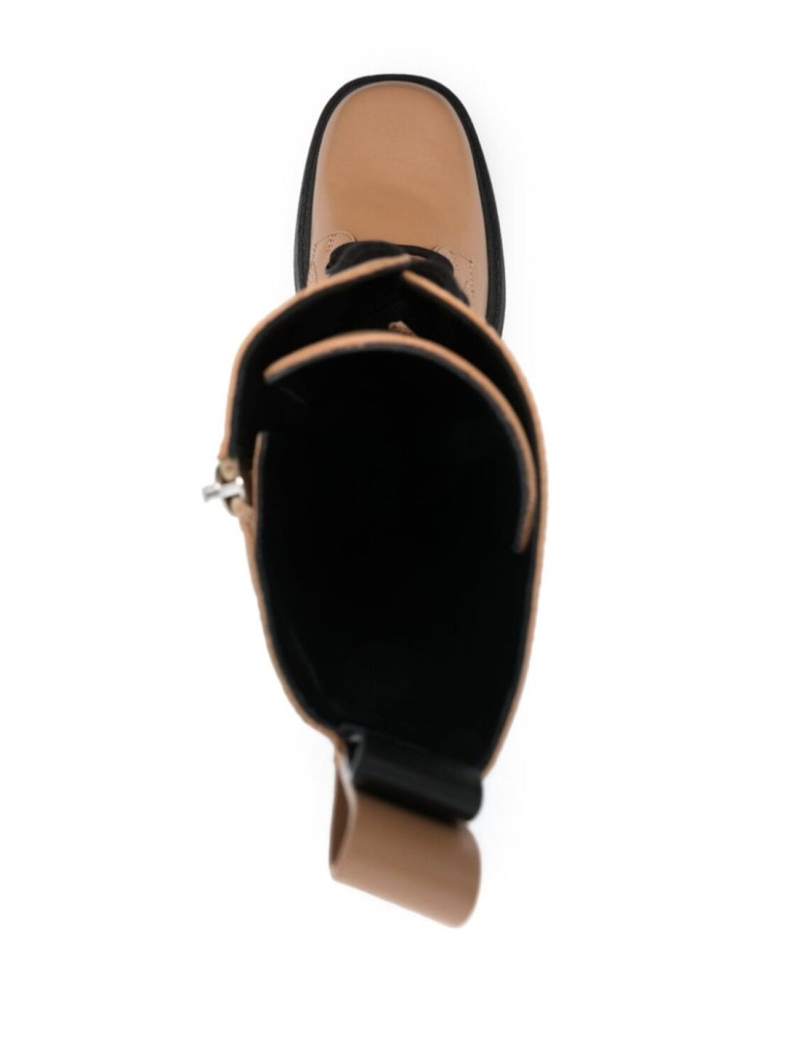 Карамельный, телячья кожа, петля для подтягивания сзади, закругленный носок, шнуровка спереди, застежка на молнии сбоку и низкий блочный каблук.