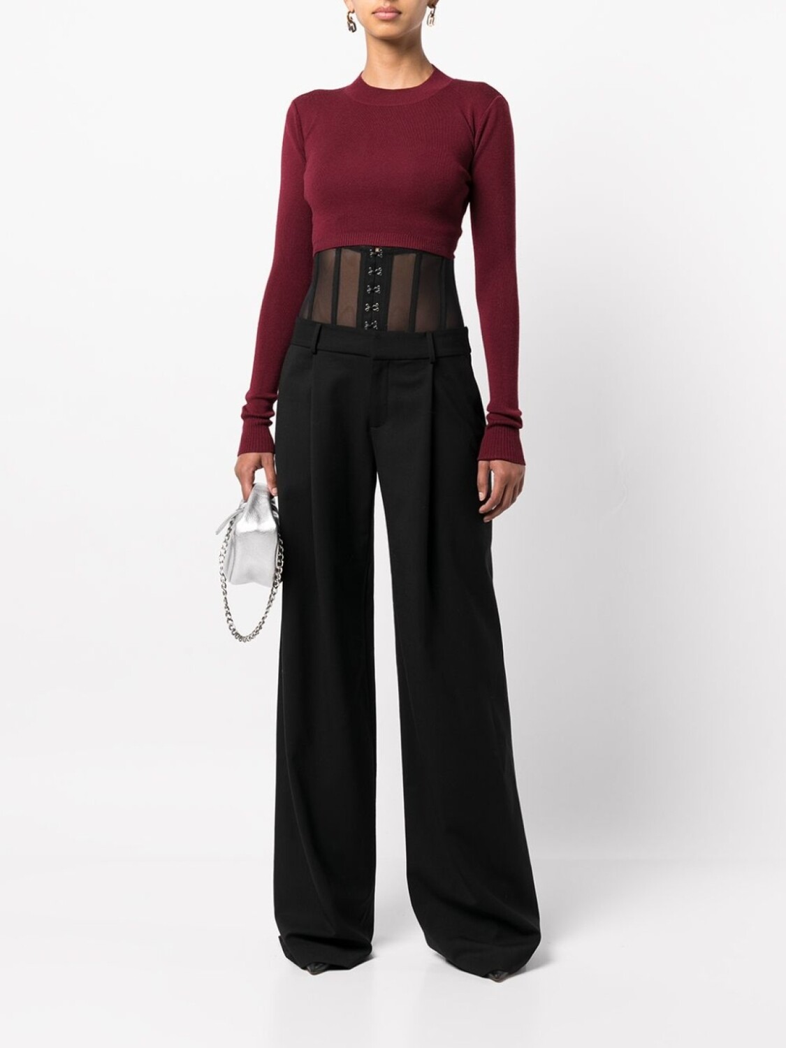 Шнуровка, вязаные края в рубчик, круглый вырез, длинные рукава и укороченная длина.