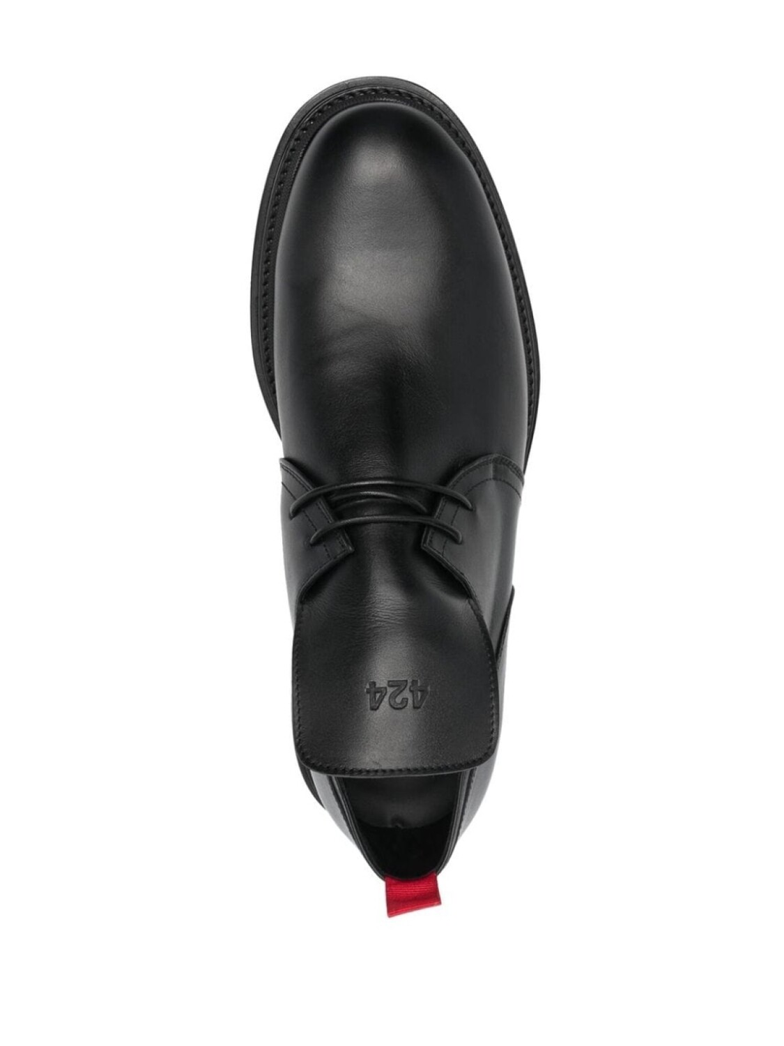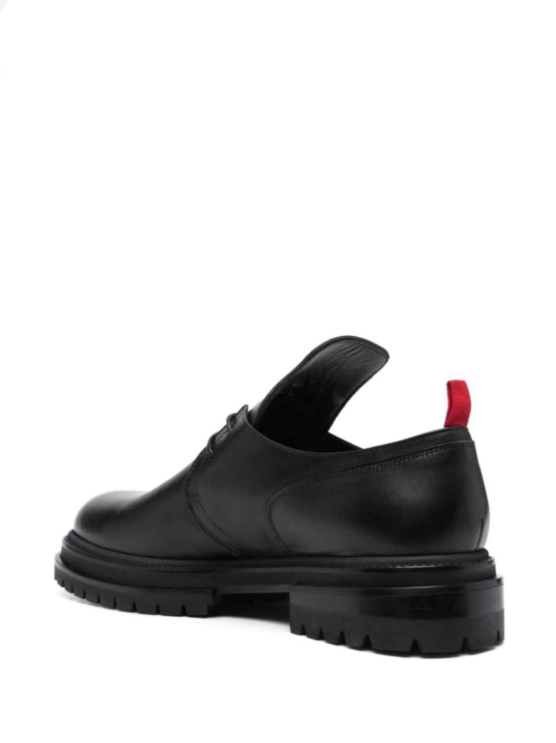 Черный, телячья кожа, тисненый логотип на язычке, шнуровка спереди, петля для подтягивания сзади и плоская резиновая подошва.