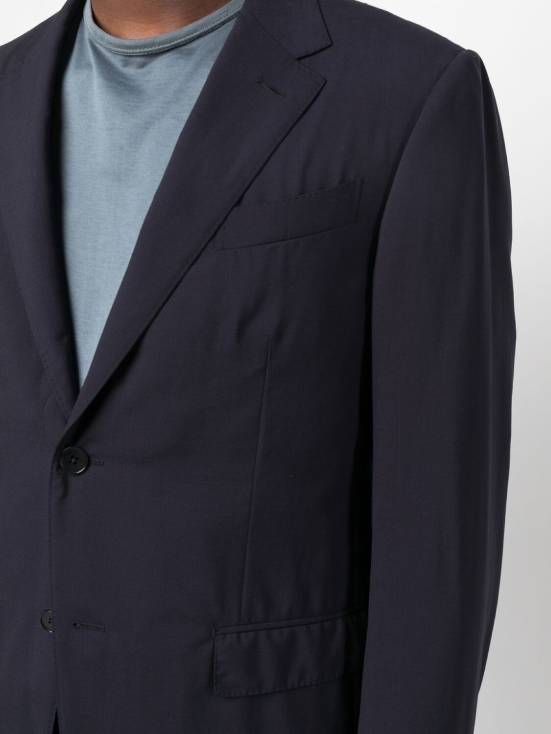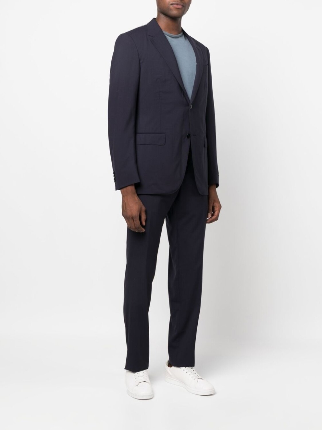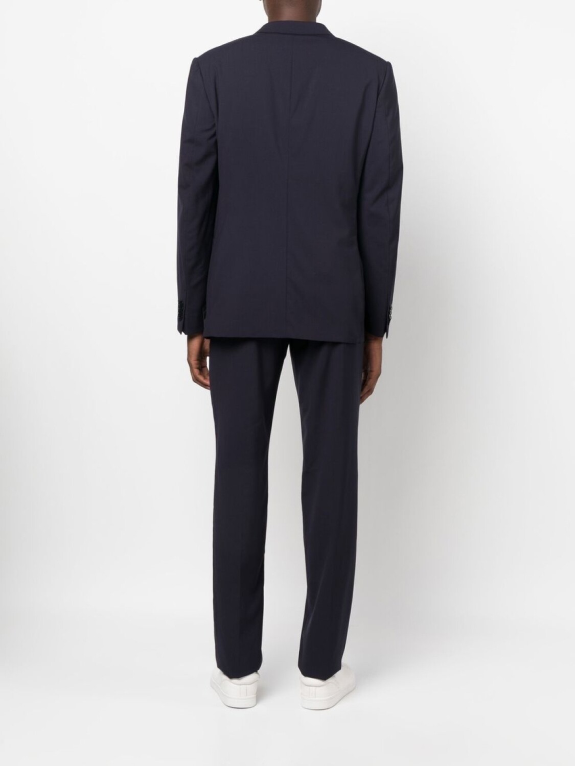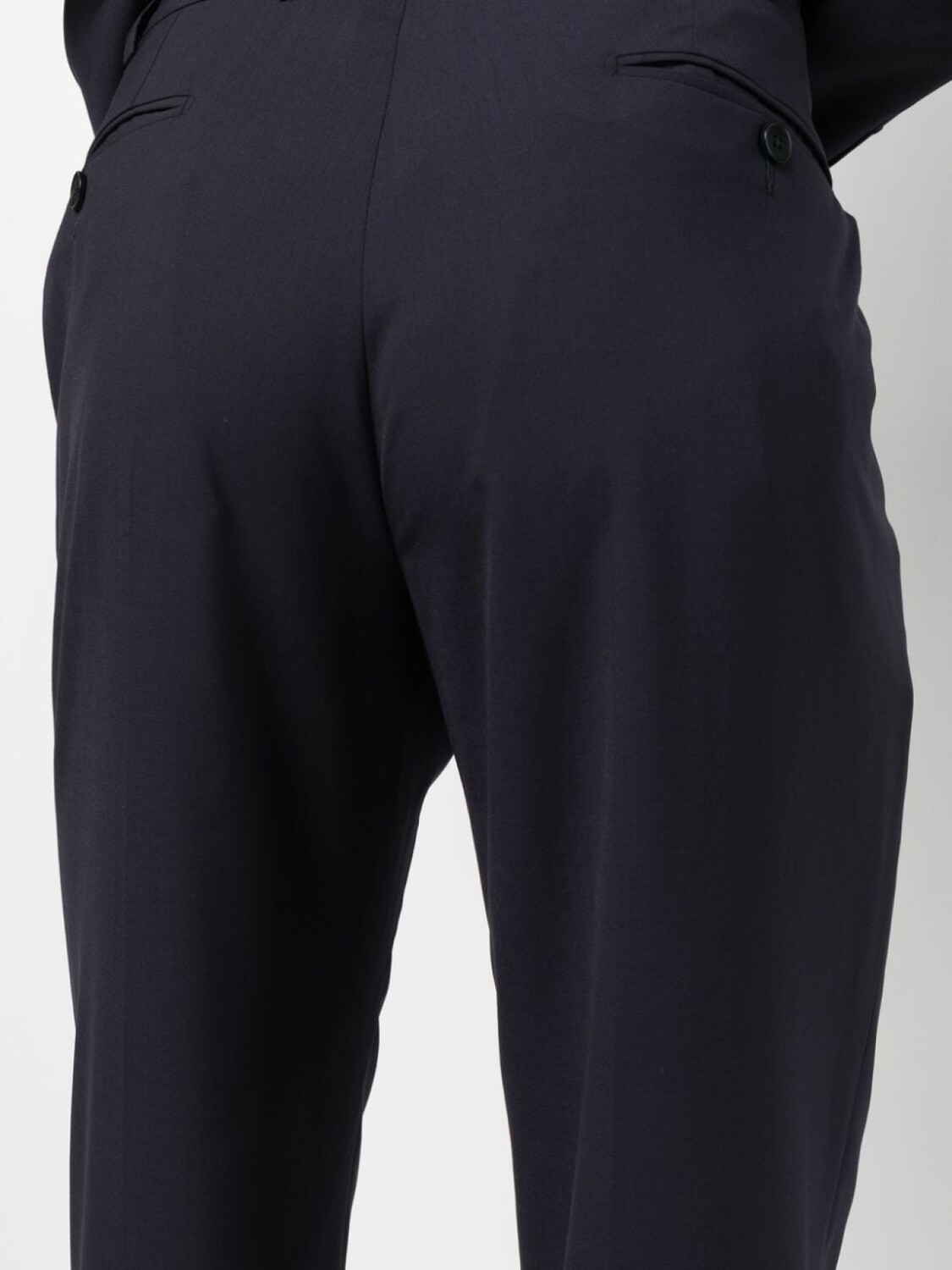 Темно-синий, шерсть, заостренные лацканы, застежка на пуговицах спереди, длинные рукава, манжеты на пуговицах, прорезной карман на груди, два передних кармана с клапанами, застежка на молнии и пуговице спереди, стрелки, два прорезных кармана по бокам, два кармана с листочкой сзади и петли для ремня.