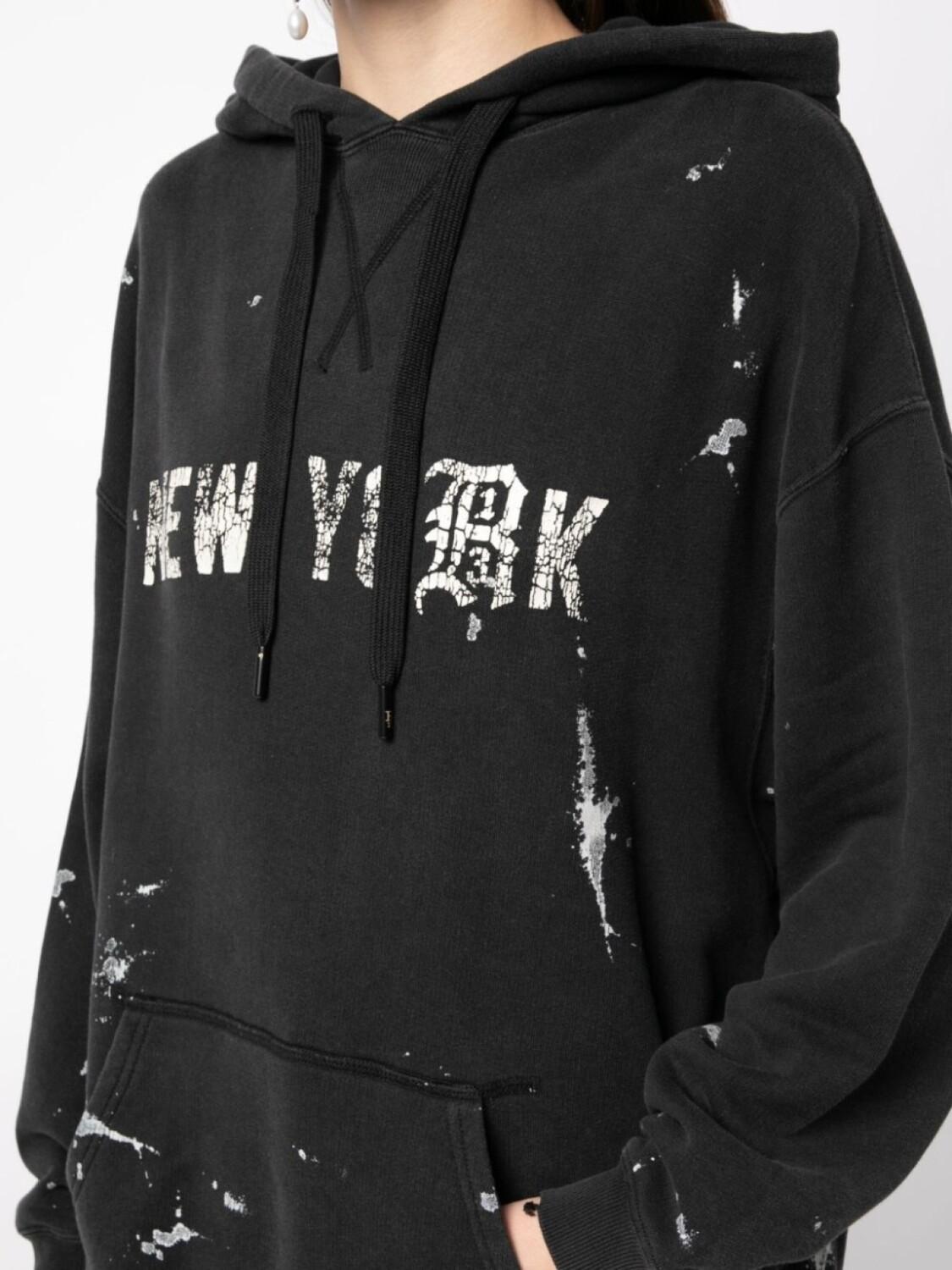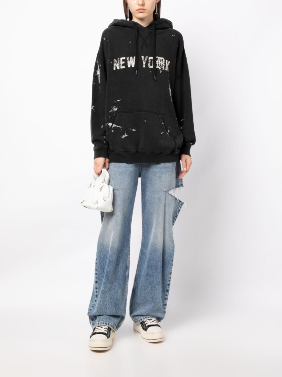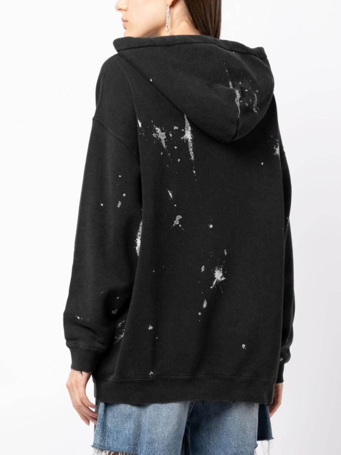 Черный, смесовый хлопок, искусственно состаренное покрытие, принт с надписью спереди, эффект разбрызганной краски, затягивающийся на шнурок капюшон, приспущенные плечи, длинные рукава и карман-муфта.