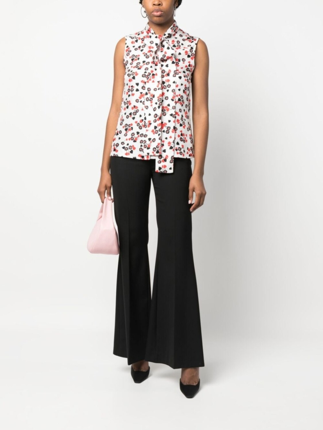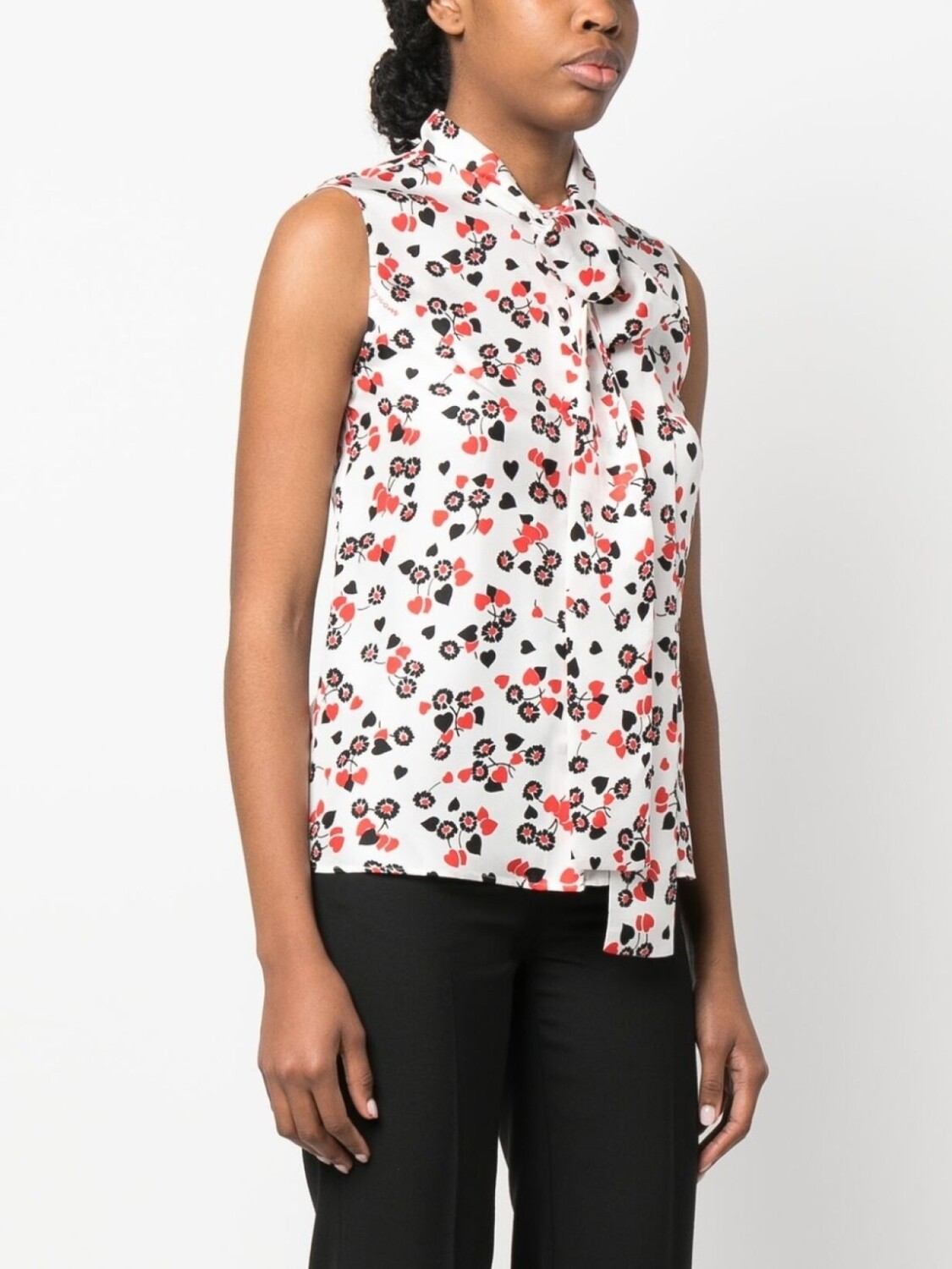 Шелк, цветочный принт, воротник с бантом, застежка на пуговицах спереди, без рукавов и прямой подол.