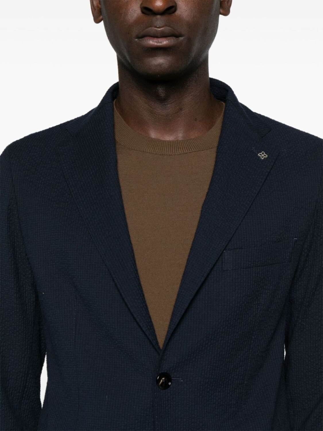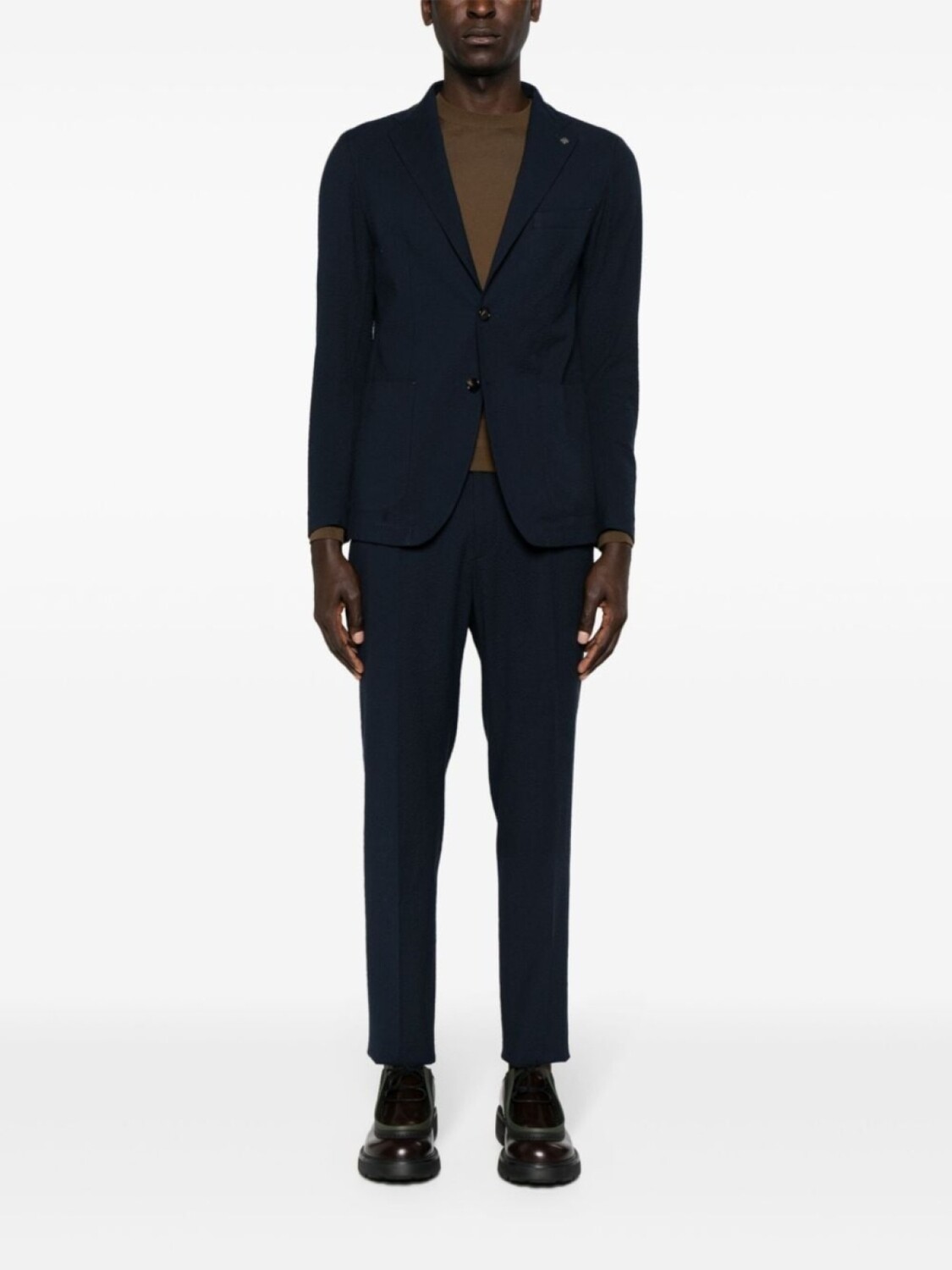 темно-синий, хлопок, сирсакер, декоративная брошь, зазубренные лацканы, застежка на пуговицах спереди, длинные рукава, манжеты на пуговицах, прорезной карман на груди, два накладных кармана по бокам, модель без подкладки, два внутренних кармана, две боковые шлицы сзади, складки, узкий крой, средняя посадка, эластичный пояс на шнурке, потайная застежка на молнии и пуговицах, петли для ремня, два вшитых кармана по бокам, два кармана с листочкой сзади, стрелки, прямой подол