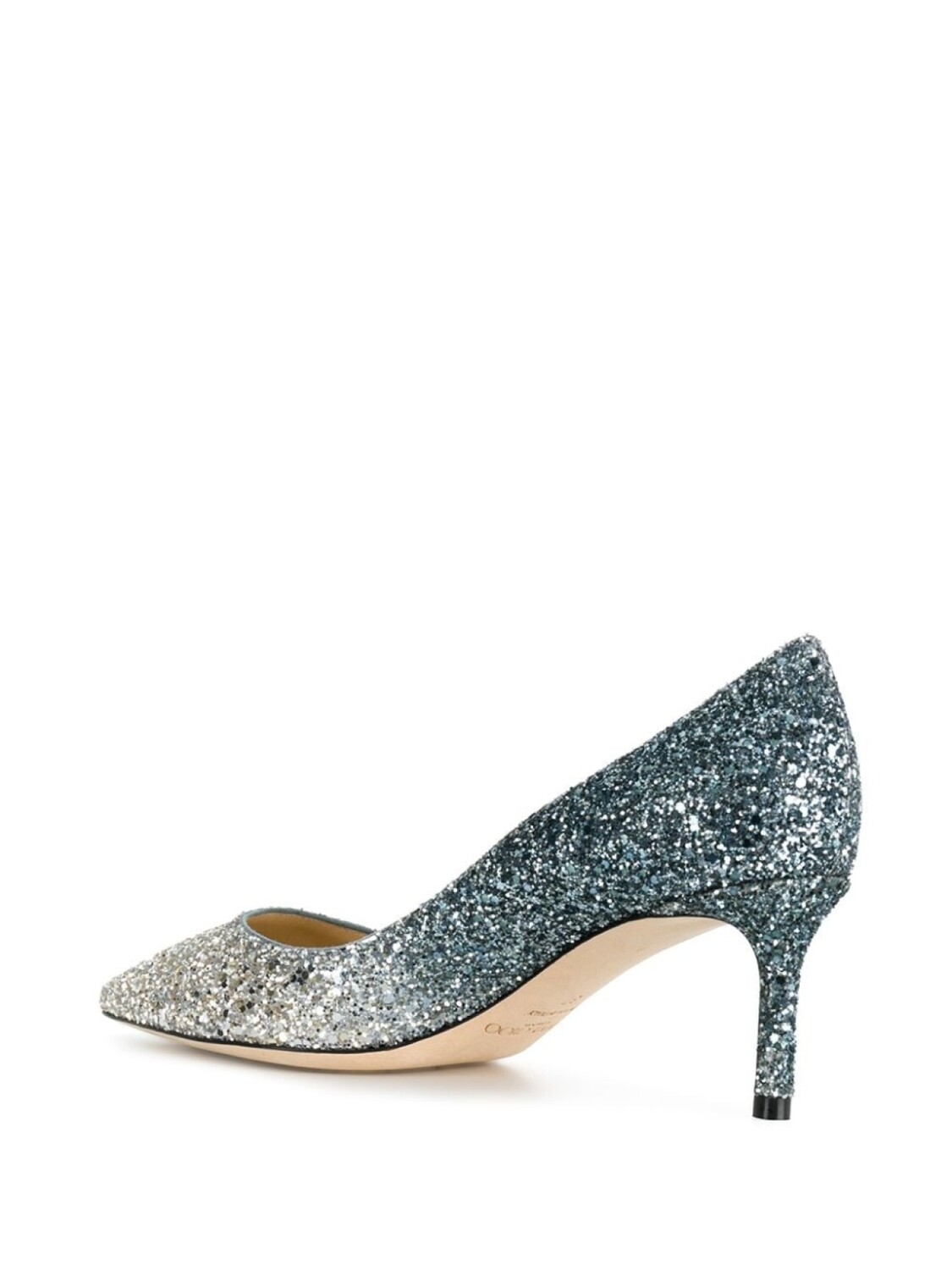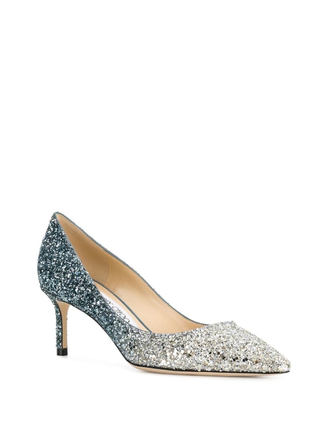 Серебристые с синим туфли-лодочки 'Romy 60' из телячьей кожи с блестками от Jimmy Choo(Джимми Чу). Заостренный носок, шпилька средней высоты.