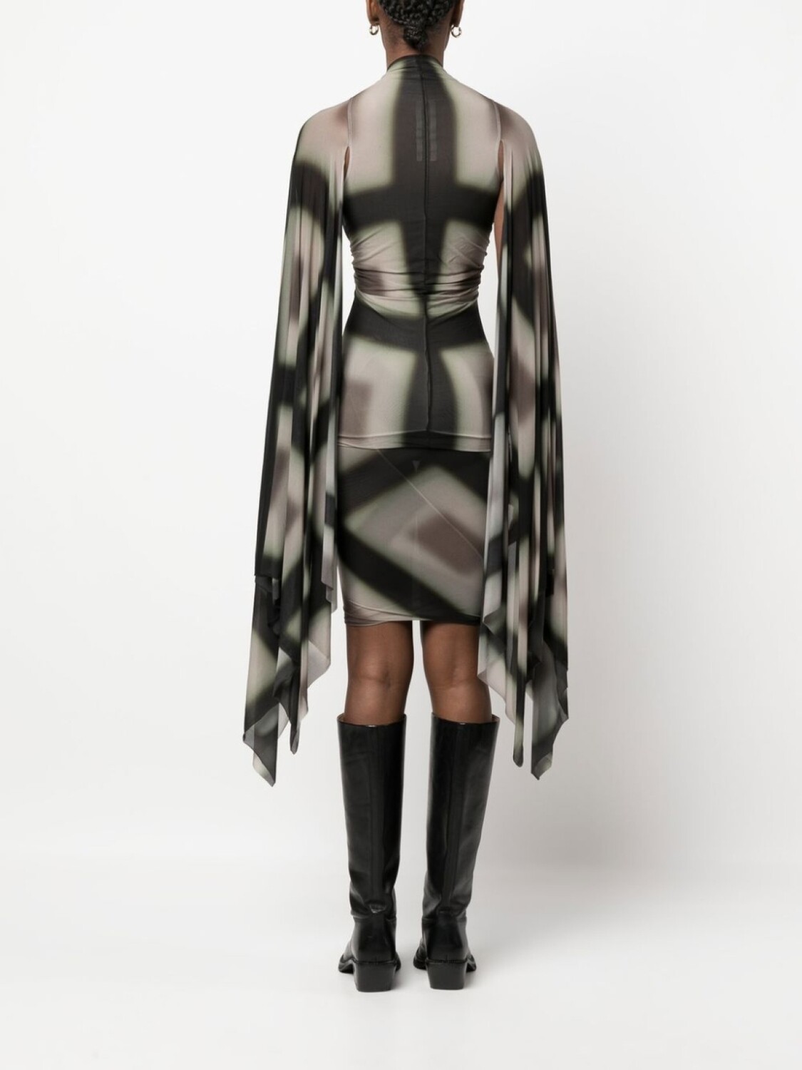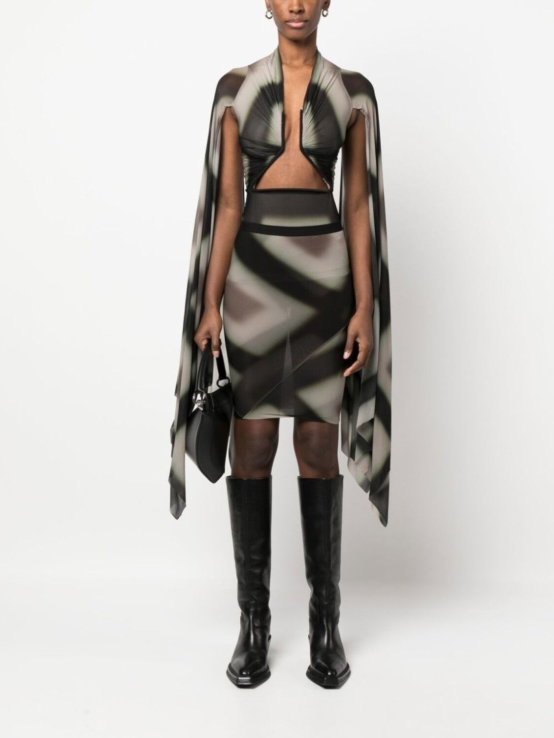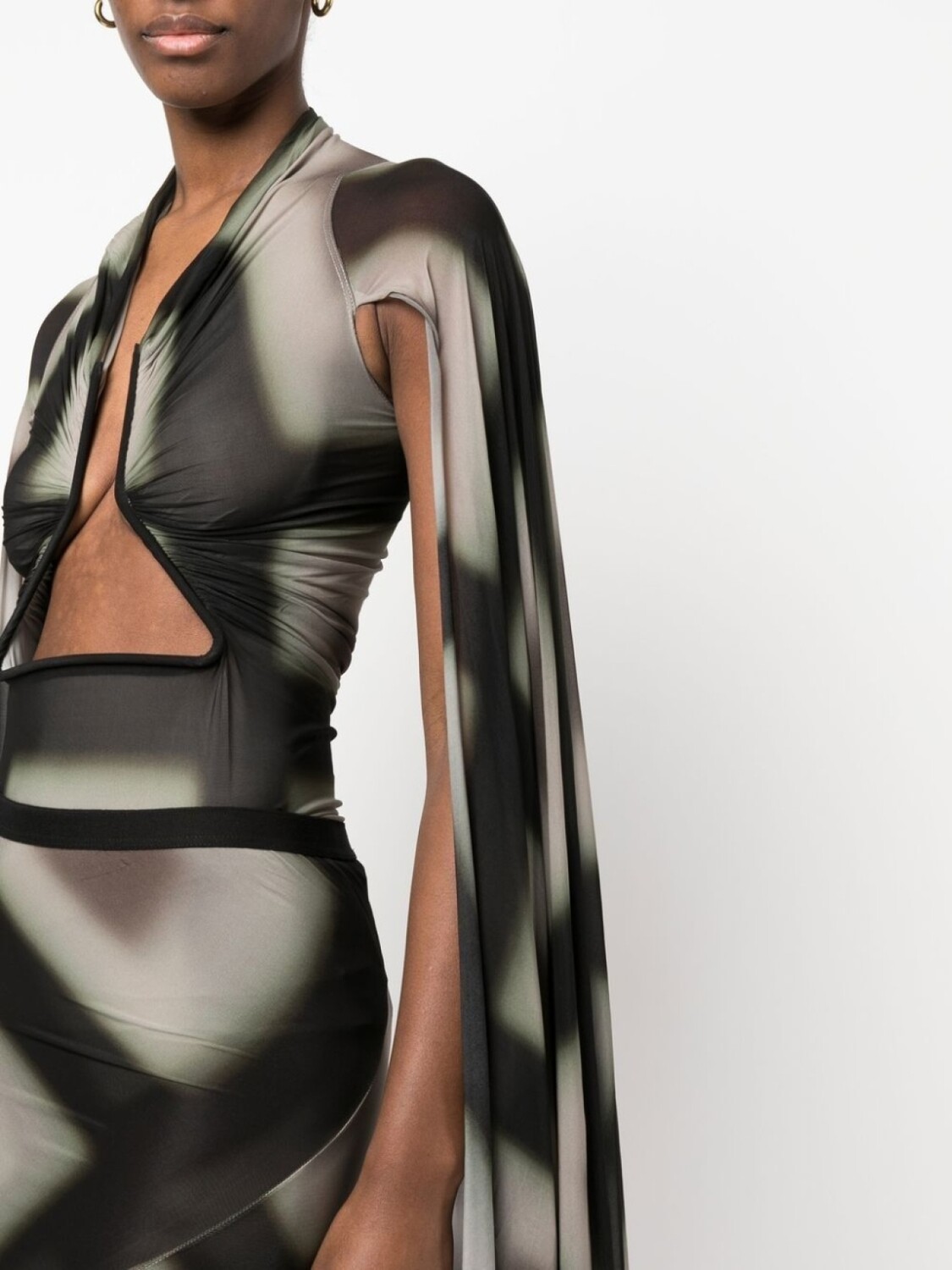 Черный, полупрозрачный дизайн, абстрактный принт, круглый вырез, длинные рукава и драпировка.