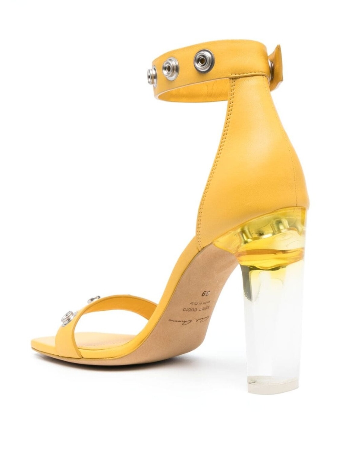 Лимонный, телячья кожа, люверсы, ремешок на щиколотке, открытый носок, стелька с логотипом и высокий каблук.