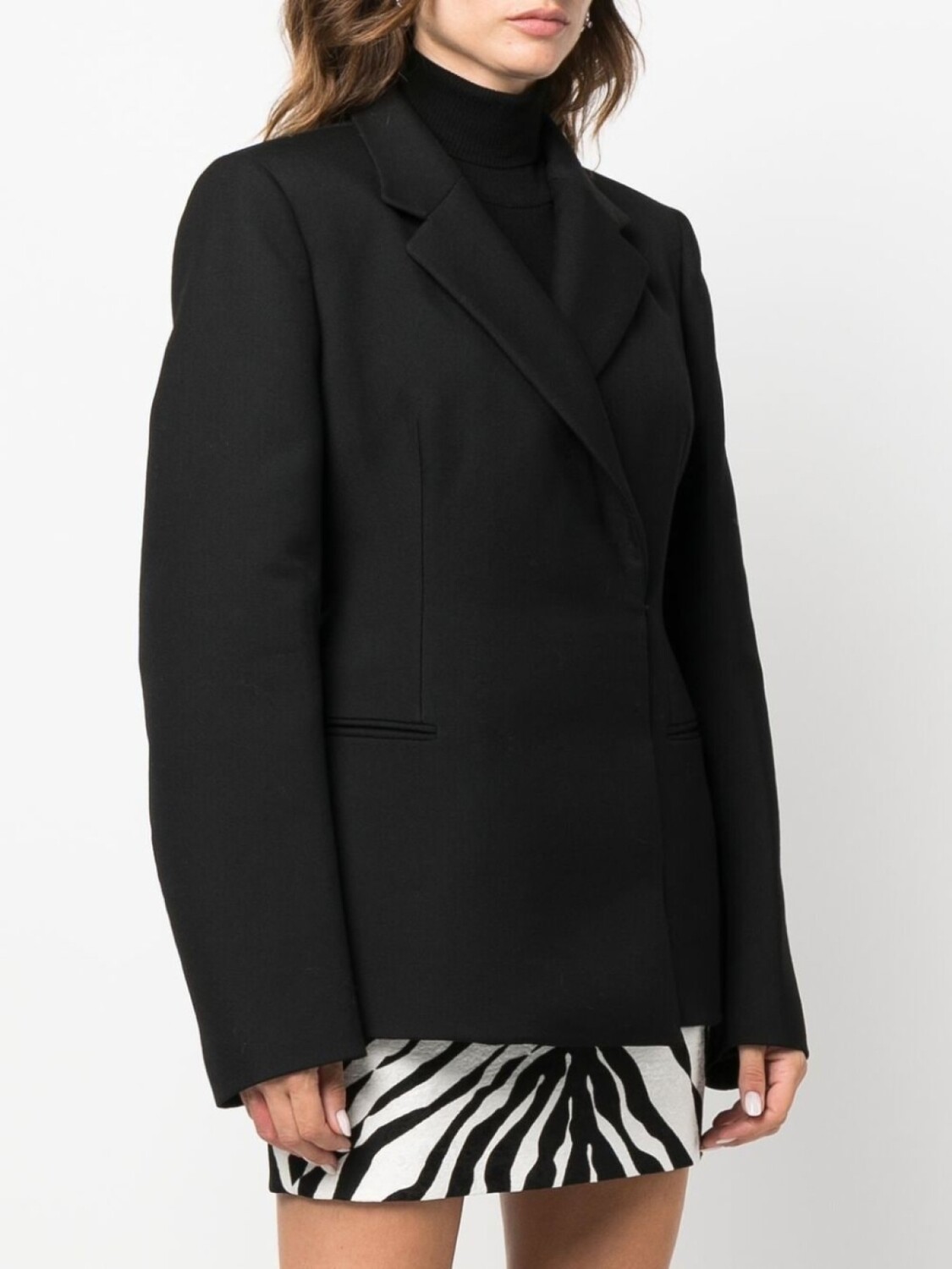 Черный, необработанная шерсть, зазубренные лацканы, двубортная застежка на кнопки и длинные рукава.