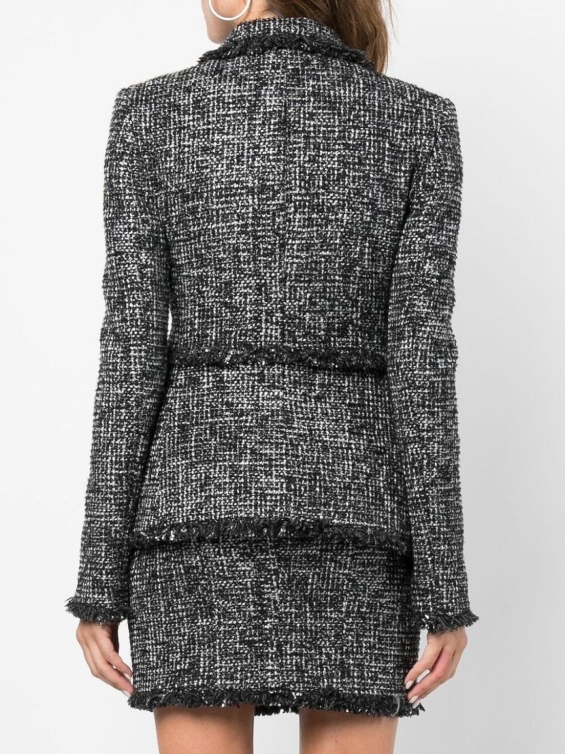 Черный/белый, зазубренные лацканы, декоративная брошь, ремень на талии, необработанные детали и два кармана с клапанами по бокам.