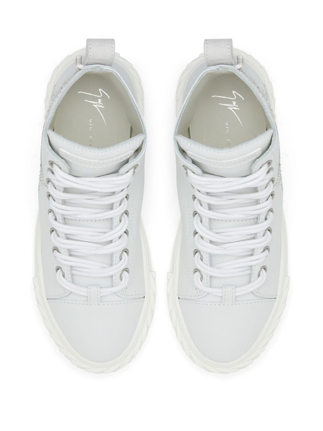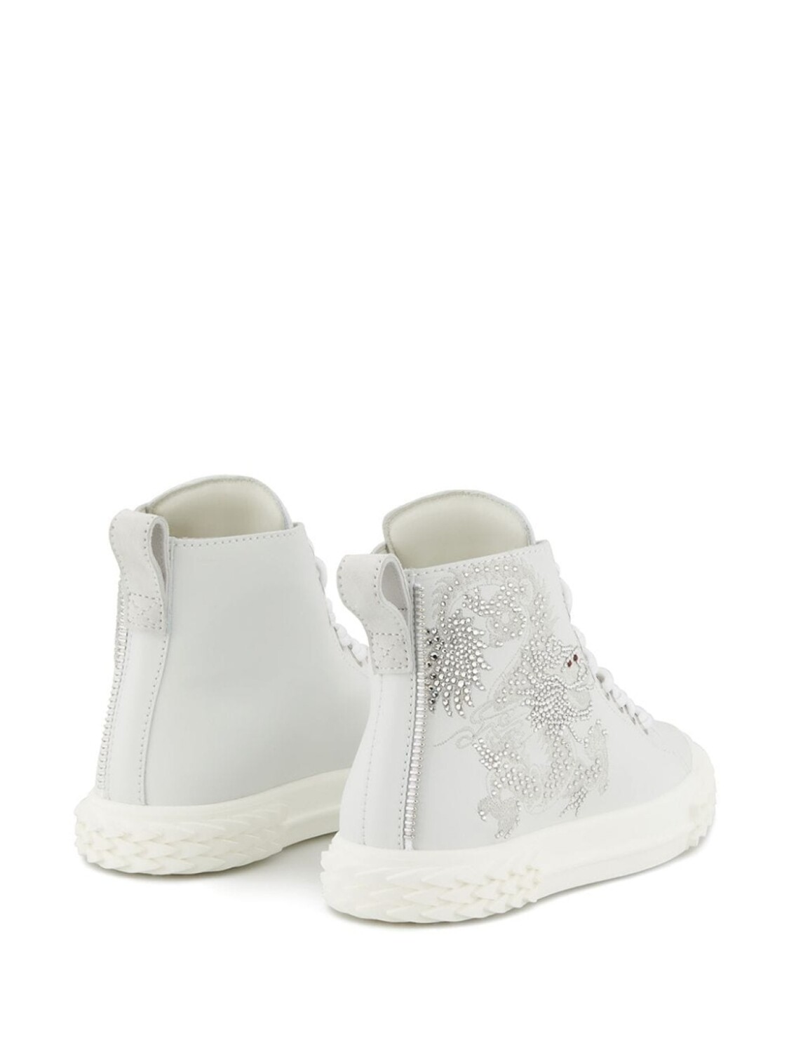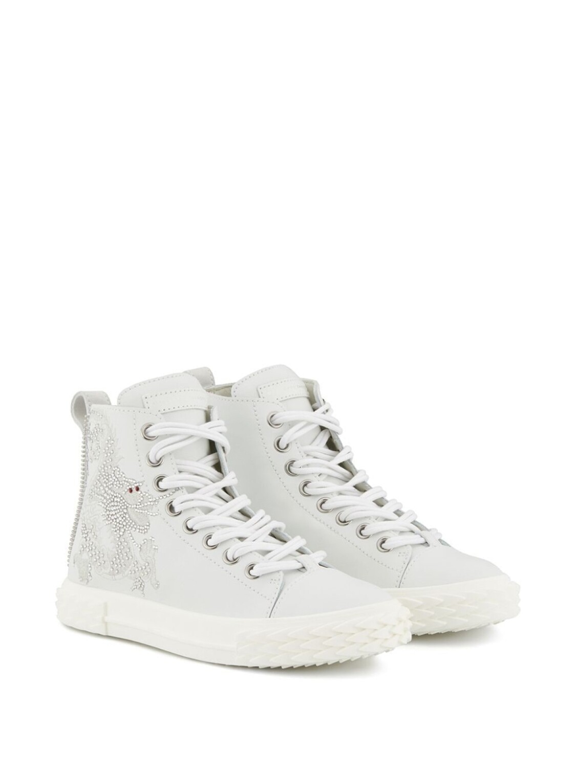 Высокие кроссовки с кристаллами от Giuseppe Zanotti (Джузеппе Занотти). Закругленный носок, шнуровка спереди, петля для подтягивания сзади, фирменная стелька и плоская подошва. Цвет: белый.