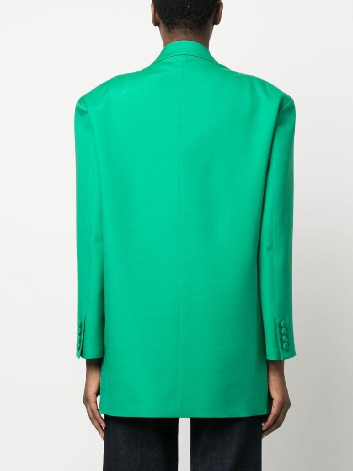 Коллекция Valentino Ready To Wear, изумрудно-зеленый, смесовая необработанная шерсть, шелковая подкладка, классические лацканы, двубортная застежка на кнопки, два передних кармана с клапанами, длинные рукава и прямой подол.