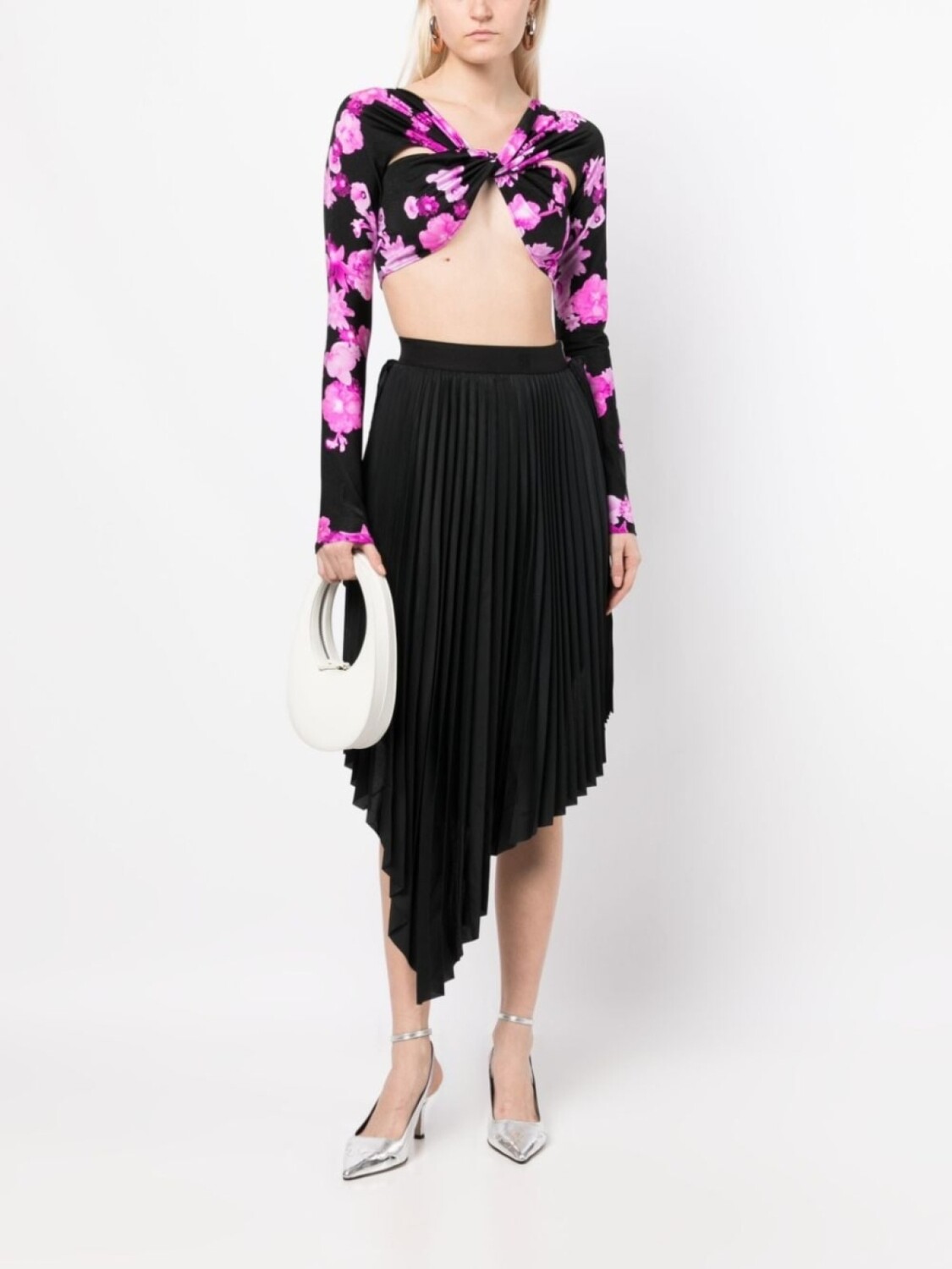 Черный, розовый, декор в виде узла, сплошной цветочный принт, длинные рукава и укороченная длина.