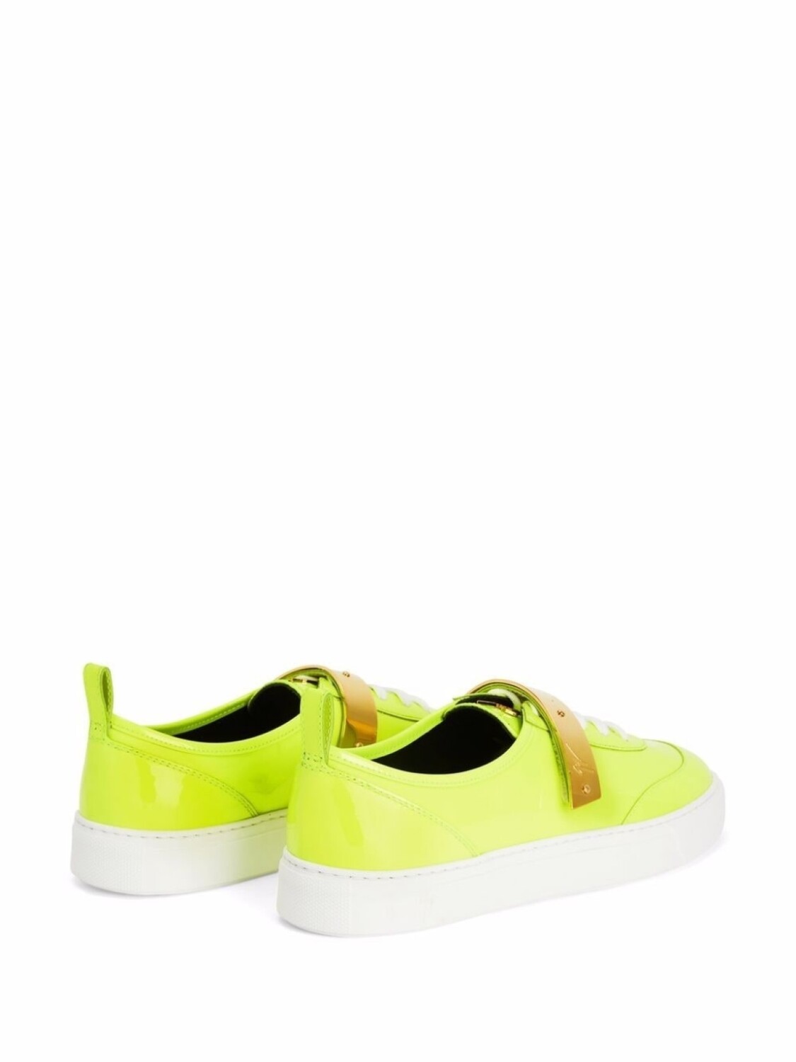 Глянцевая фактура, золотистая фурнитура, застежка на липучке спереди, закругленный носок, шнуровка спереди, кожаная стелька с логотипом, петля для подтягивания сзади и плоская резиновая подошва. Цвет: желтый.